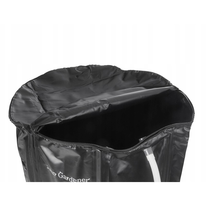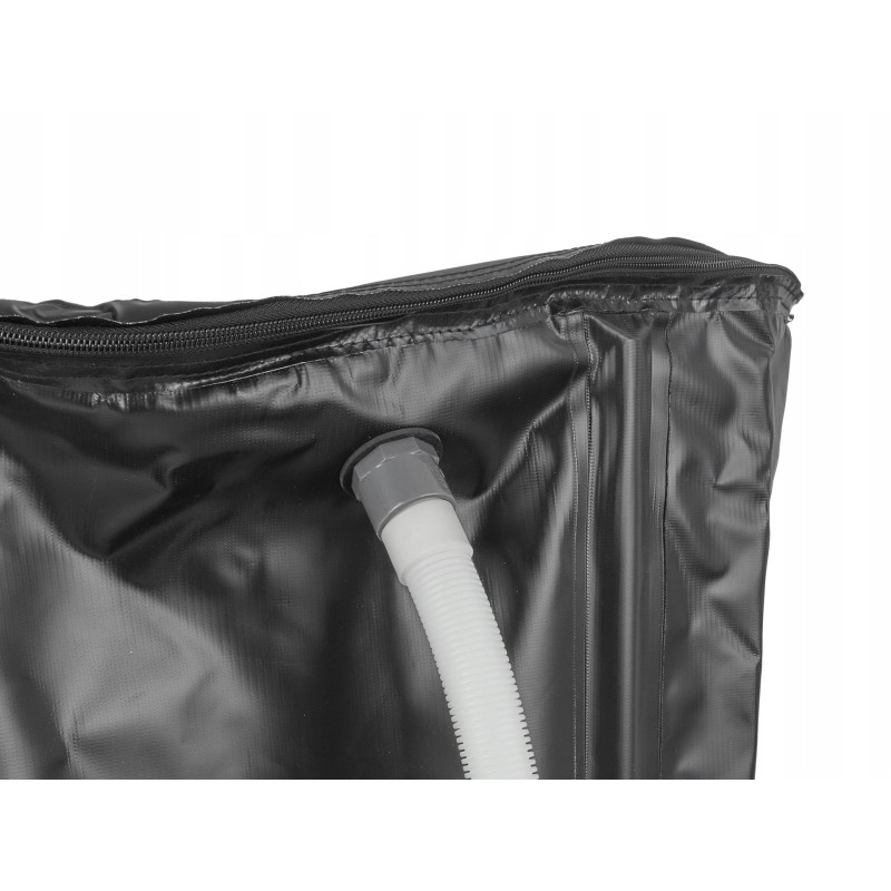Der Behälter ist mit einem integrierten Filter ausgestattet, der die Sauberkeit des aufgefangenen Wassers gewährleistet, sowie mit einem Überlaufventil, das ein Überlaufen verhindert. Zusätzlich lässt er sich mit einem doppelseitigen Reißverschluss verschließen, was seine Funktionalität und die Sicherheit bei der Nutzung erhöht.