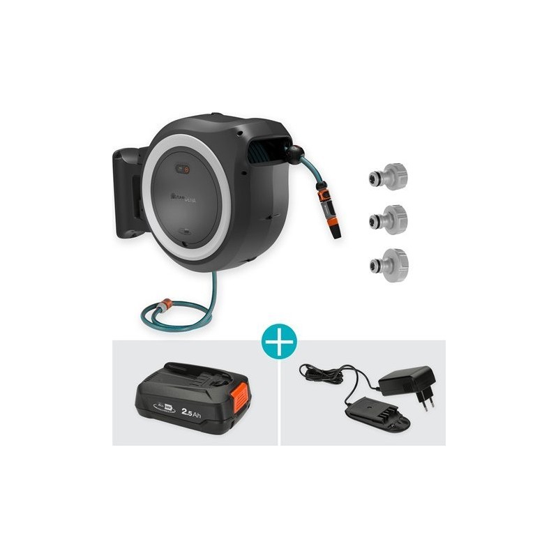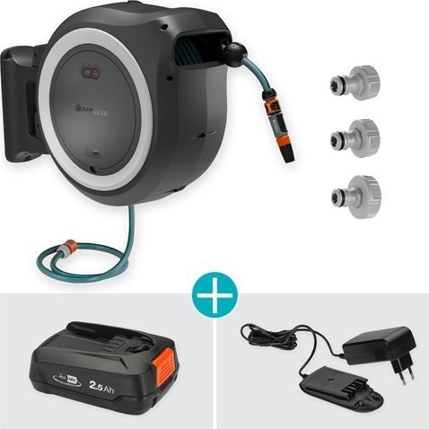 Gardena Akku-Wandschlauchbox PowerRoll XL 35 m. Im Lieferumfang enthalten: Ladegerät und Akku