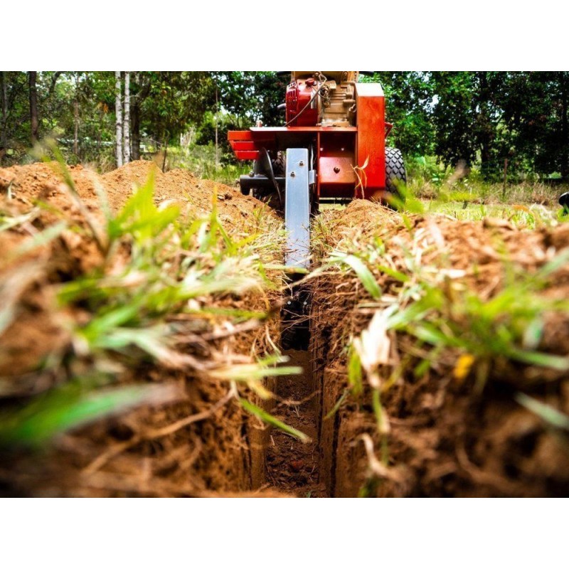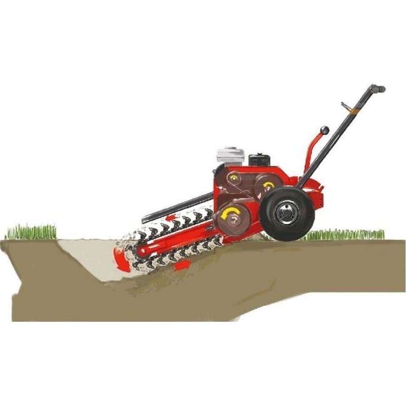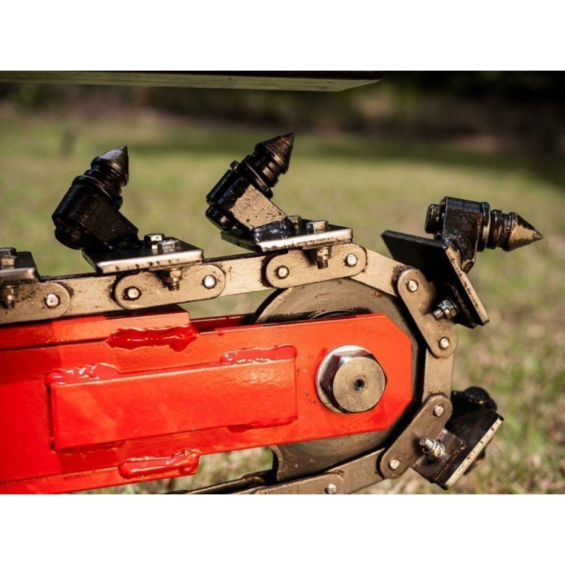 Der Kettenbagger Cedrus KP01 wird von einem leistungsstarken und effizienten Loncin G420F-Motor angetrieben. Der Bagger ist mit einer 2000 mm langen Kette mit 27 Hartmetallzähnen sowie einem Bohrer ausgestattet, der die Erde neben der Baugrube ablegt. Der Kettenbagger kann in 3 verschiedenen Tiefen graben: 20 cm, 40 cm, 60 cm. Während des Kettenbetriebs können die Laufräder blockiert werden. Die Leistung des Kettenbaggers KP01 hängt vom Boden ab, in dem er arbeitet, und kann bis zu 60 m/h betragen.