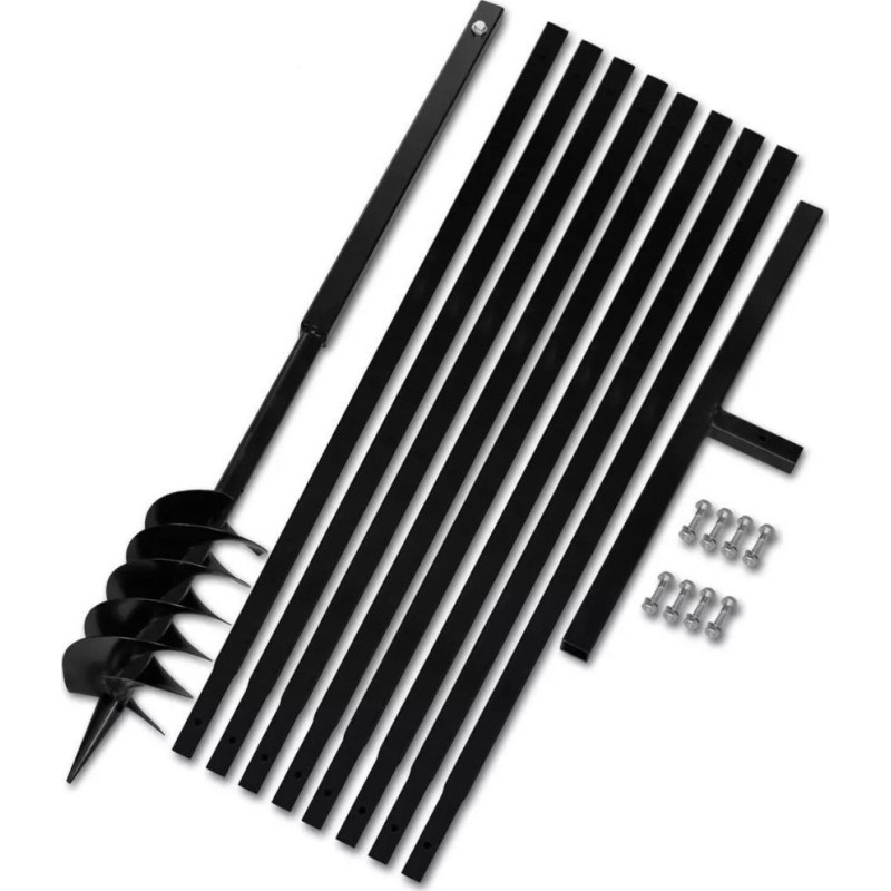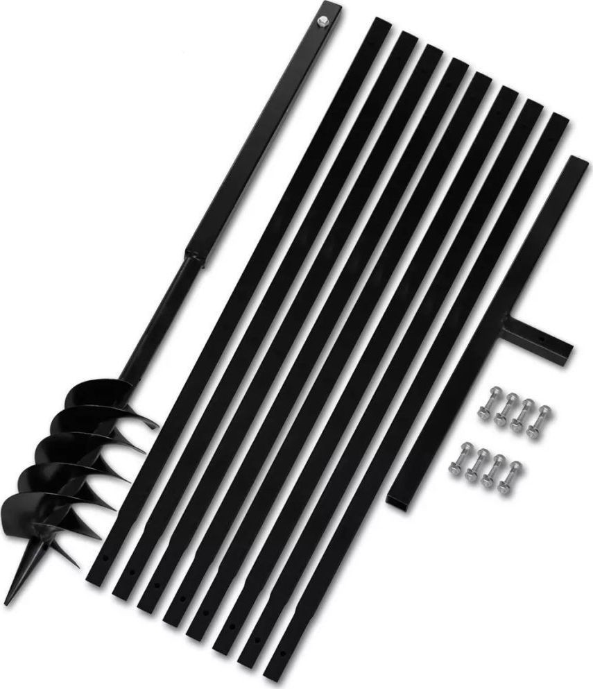 - Im Lieferumfang enthalten sind ein Erdbohrer, ein Griff, 8 Verlängerungsrohre und Schrauben.