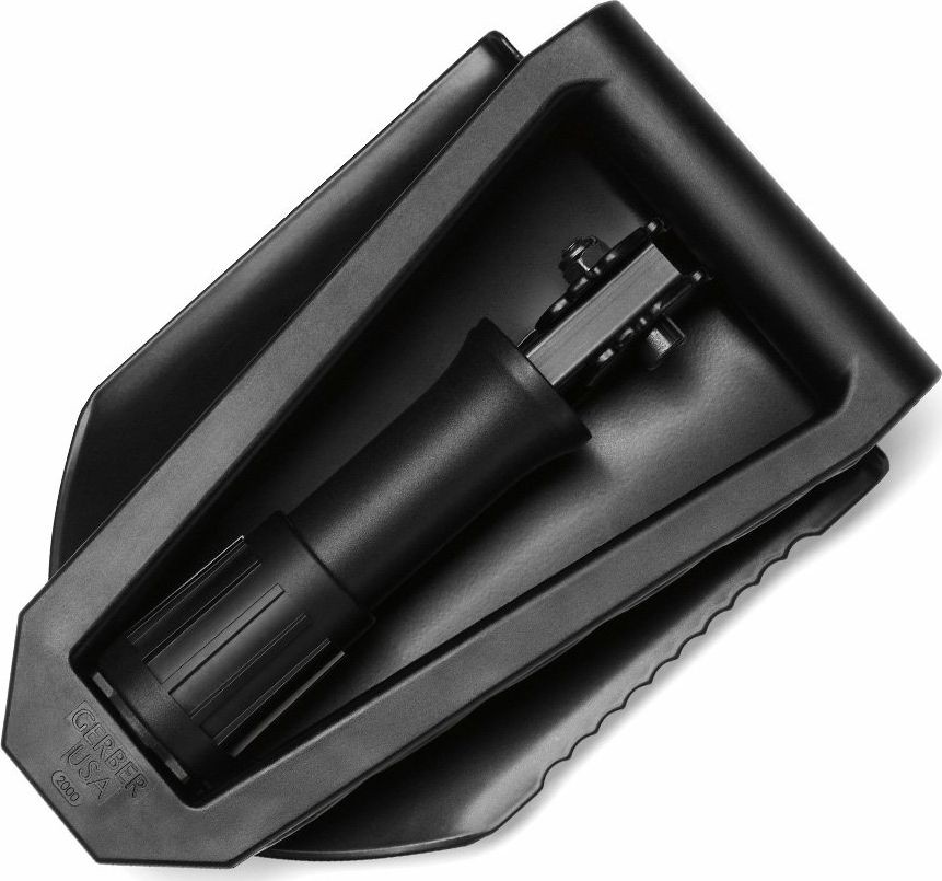 Leichte, dreifach zusammenklappbare Schaufel mit gezahnter Schaufelseite, hergestellt von Gerber Gear. Dank der gezahnten Verbindung zwischen Schaufel und Stiel lässt sie sich in verschiedenen Winkeln drehen.