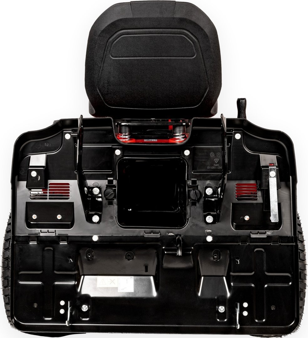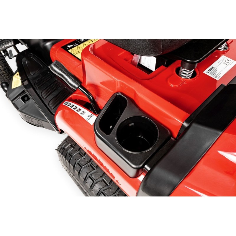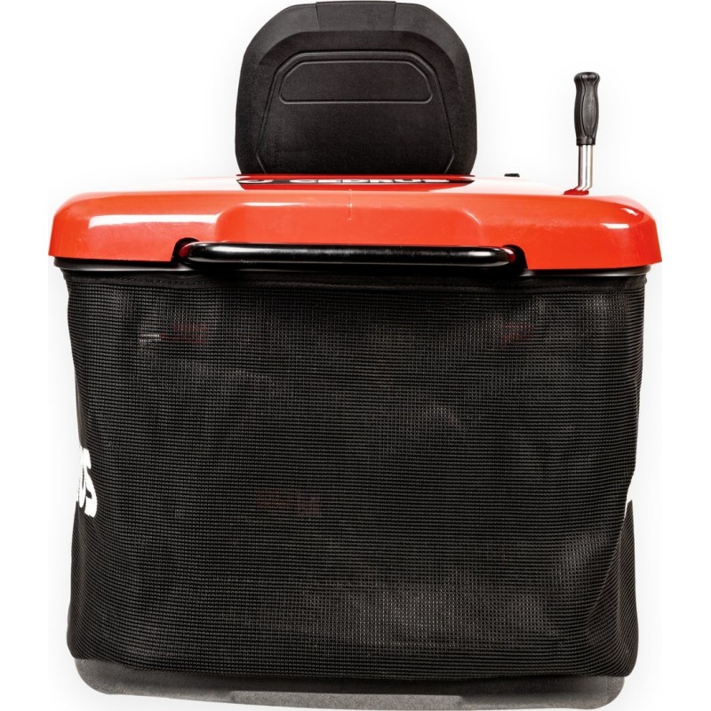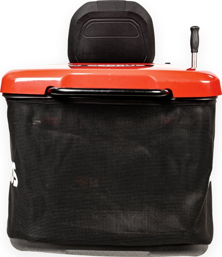- Großer Grasfangkorb mit 245 l Fassungsvermögen, der vom Fahrersitz aus per Hebel entleert werden kann.