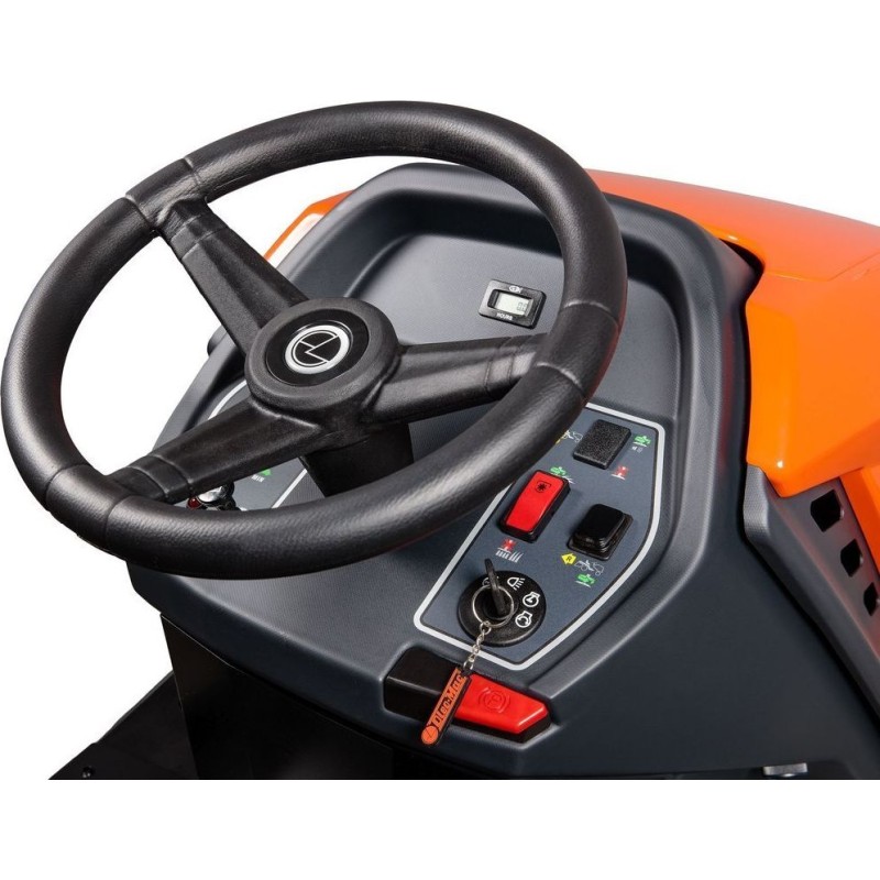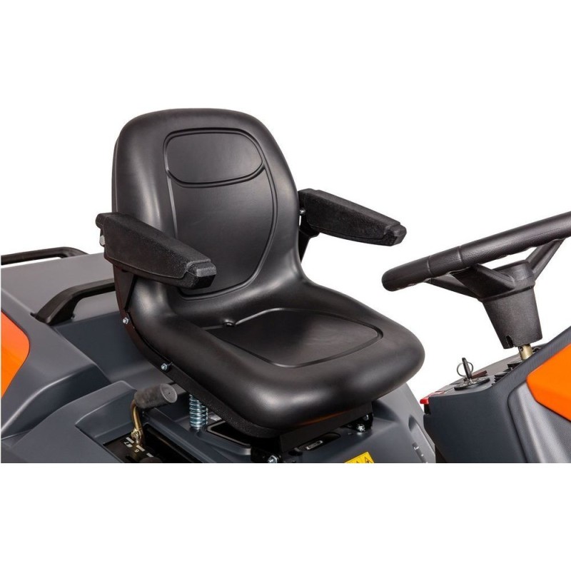 - Die Geschwindigkeit wird über ein Doppelpedal geregelt, das direkt auf den hydrostatischen Antrieb wirkt. Dank dieser Lösung kann die Fahrtrichtung geändert und die Fahrgeschwindigkeit auch während des Entleerens des Grasbehälters gesteuert werden.