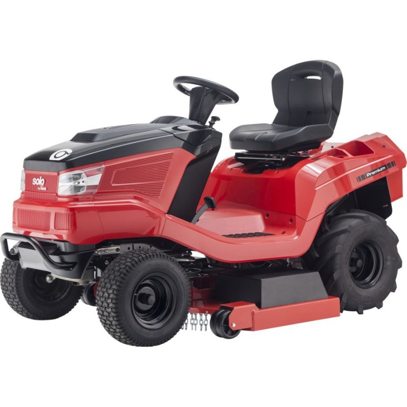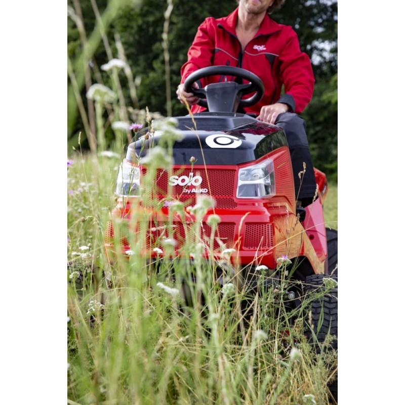 Der Traktor verfügt über eine stoß- und korrosionsbeständige Karosserie, die immer wie neu aussieht, und die schwere, robuste Vorderachse sowie die breiten Landwirtschaftsreifen garantieren eine hervorragende Stabilität der Maschine selbst unter schwierigsten Bedingungen. Darüber hinaus ist der vorgestellte Gartentraktor Solo by AL-KO mit einer Frontstoßstange aus Metall ausgestattet.