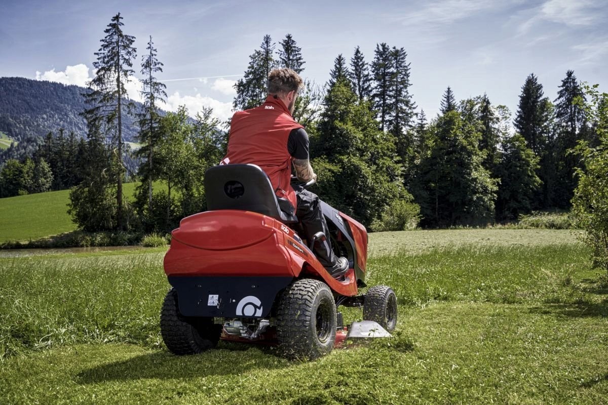 Die Schnitthöhe lässt sich über einen praktischen Hebel links neben dem Fahrersitz im Bereich von 30 bis 80 mm einstellen. Hinzu kommt eine elektromagnetische Kupplung, die das Schneidmesser per Knopfdruck zuschaltet. Die Arbeit mit diesem Traktor ist aus mehreren Gründen ein reines Vergnügen. Vor allem liegt das am hydrostatischen Antrieb mit Fußpedal, der das Vor- und Rückwärtsfahren ermöglicht.