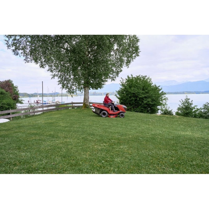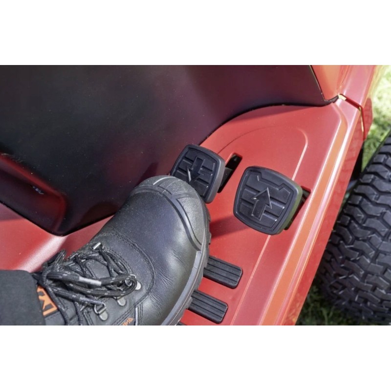Der AL-KO Gartentraktor T 22-105.4 HD-A V2 wird von einem hydrostatischen Getriebe angetrieben, dessen Laufruhe selbst die anspruchsvollsten Nutzer zufriedenstellt. Vor allem ist es ein leises Aggregat, das sich durch einen gleichmäßigen Lauf auszeichnet. Dieses neue Traktormodell verfügt über einen optimierten Antriebsstrang, was die Leistung der Maschine verbessert und höhere Geschwindigkeiten (11 km/h) ermöglicht. Die verbesserte Führung des Antriebsriemens überträgt die höhere Leistung effektiv und effizient auf die Hinterachse. Das bedeutet nicht nur schnelleres Fahren, sondern auch schnelleres Mähen – für maximale Effizienz. Die Funktionsweise des Getriebes unterscheidet sich nicht von der in PKWs verwendeten. Die Fahrgeschwindigkeit wird über zwei nebeneinander angeordnete Pedale geregelt. Je stärker man das Pedal betätigt, desto schneller wird die Maschine; lässt man den Druck nach, wird sie langsamer.