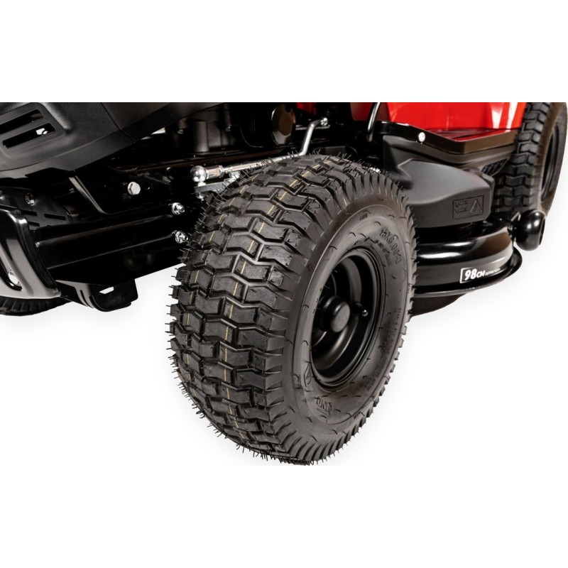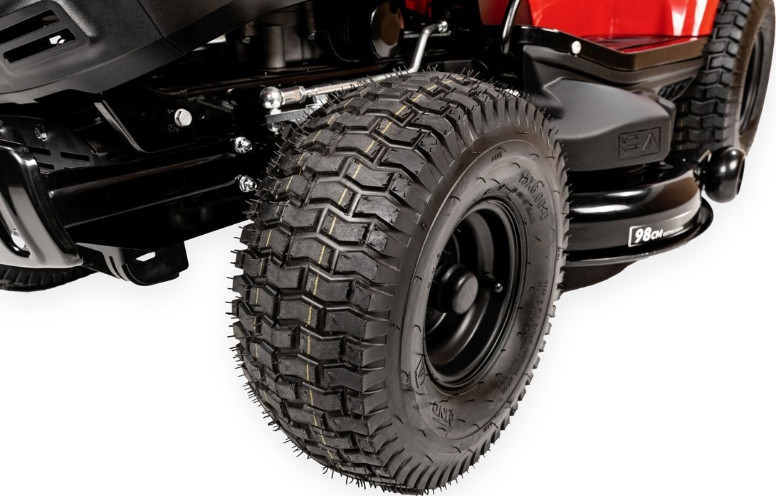 - Die breiten Räder verfügen über ein spezielles Profil, das das Gras während der Arbeit nicht beschädigt.