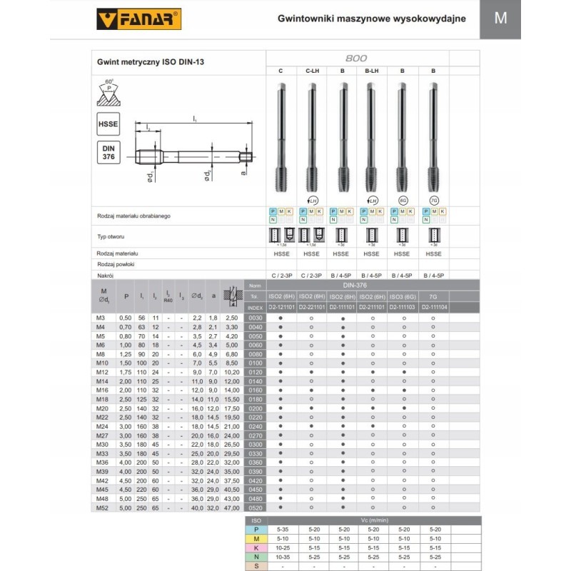 Maschinengewindebohrer DIN-376-C M ISO2(6H) LH HSSE 800 LINKS zum Gewindeschneiden von Durchgangs- und Sacklöchern mit Durchgangsschaft.HSS- und HSSE 800-Werkzeuge zur Bearbeitung von Kohlenstoffstahl, Automatenstahl und Baustahl mit einer Festigkeit von Rm ≤ 800 MPa