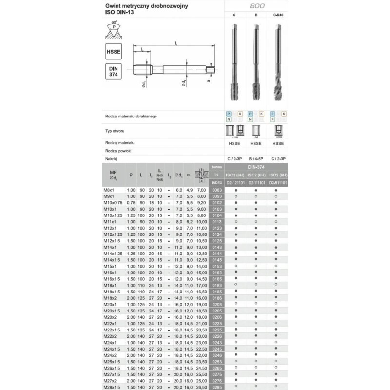 Eine Gruppe von Gewindebohrern mit einer Geometrie und Mikrogeometrie, die für die Bearbeitung von Kohlenstoffstählen, niedriglegierten Stählen mit einer Streckgrenze von bis zu 800 MPa sowie Aluminium ausgelegt ist. Das Werkzeugmaterial ist HSSE-Schnellarbeitsstahl mit einem Kobaltanteil von 5 %, der eine hohe Stabilität der Schneiden und eine effiziente Bearbeitung gewährleistet.