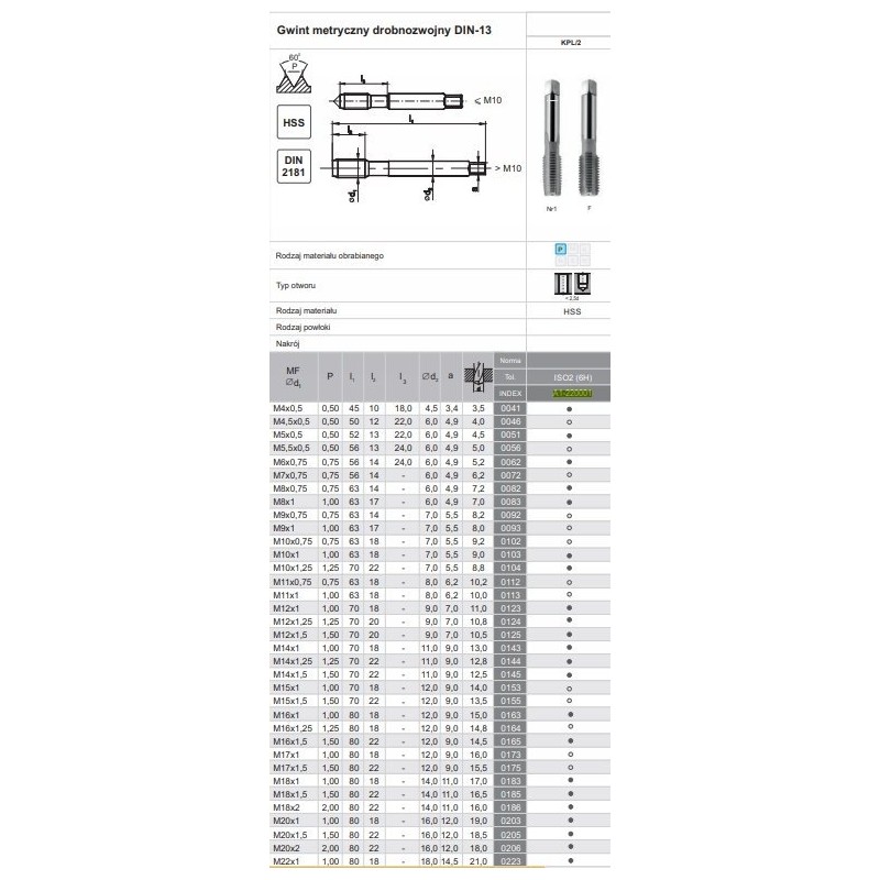 Handwerkzeuge für den allgemeinen Gebrauch für metrische und zöllige Gewinde sind in 2- oder 3-teiligen Sätzen erhältlich. Die Werkzeuge sind aus hochkohlenstoffhaltigem Schnellarbeitsstahl (HSS) gefertigt. Die Arbeitslänge des Fertiggewindebohrers beträgt ca. 2x P.
