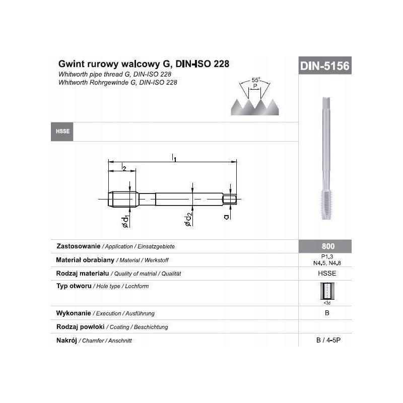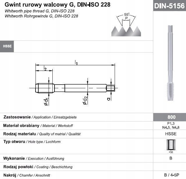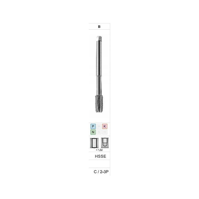 Maschinengewindebohrer mit schräger Spanfläche und B-Gewindeprofil (4-5P) für Durchgangsbohrungen, zum Gewindeschneiden von Kohlenstoff-, Automaten- und niedriglegierten Baustählen mit einer Festigkeit von 600 MPa ≤ Rm ≤ 800 MPa.