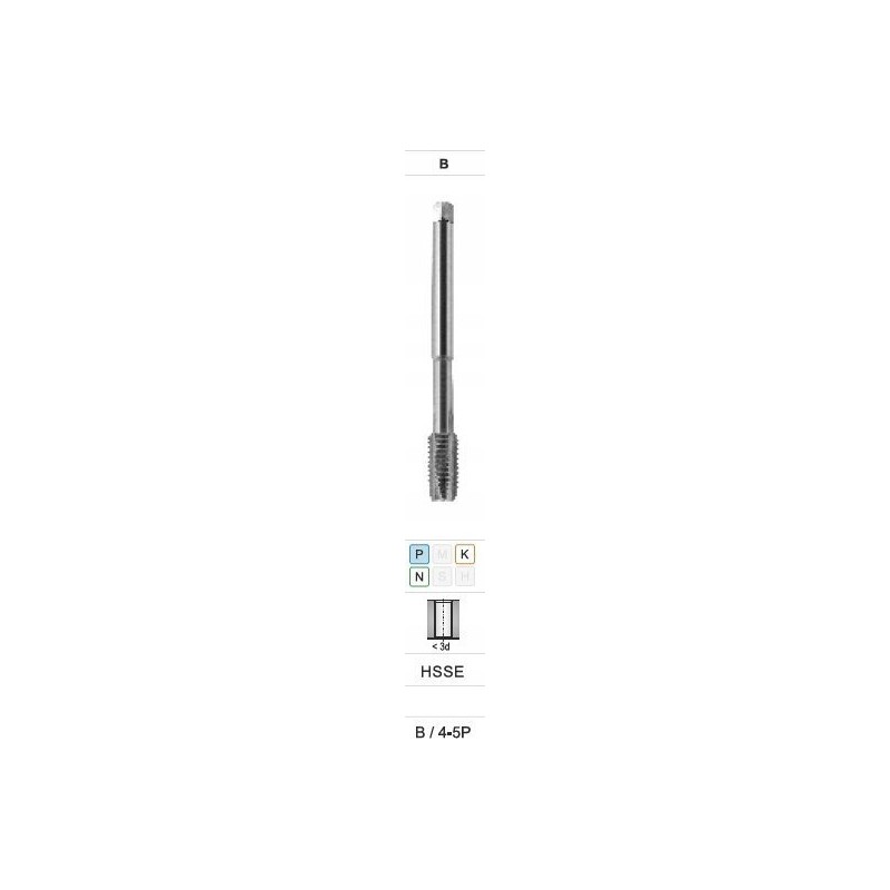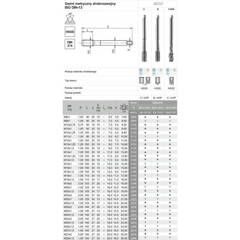 Der hochleistungsfähige Maschinengewindebohrer mit metrischem Standardgewinde, gefertigt gemäß der Norm DIN-376B 800, ist für Durchgangsbohrungen vorgesehen. Das Material, aus dem der Gewindebohrer gefertigt ist – kobalthaltiger Schnellarbeitsstahl – zeichnet sich durch eine erhöhte Wärmebeständigkeit und Verschleißfestigkeit aus. Die Behandlung im Vakuumofen gewährleistet eine hohe Härte des Werkzeugs bei gleichzeitiger Beibehaltung einer guten Zähigkeit. Der Gewindebohrer eignet sich ideal für die Bearbeitung von Kohlenstoff-, Automaten- und niedriglegiertem Baustahl mit einer Festigkeit von 600 MPa
