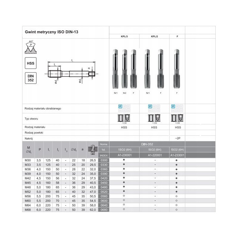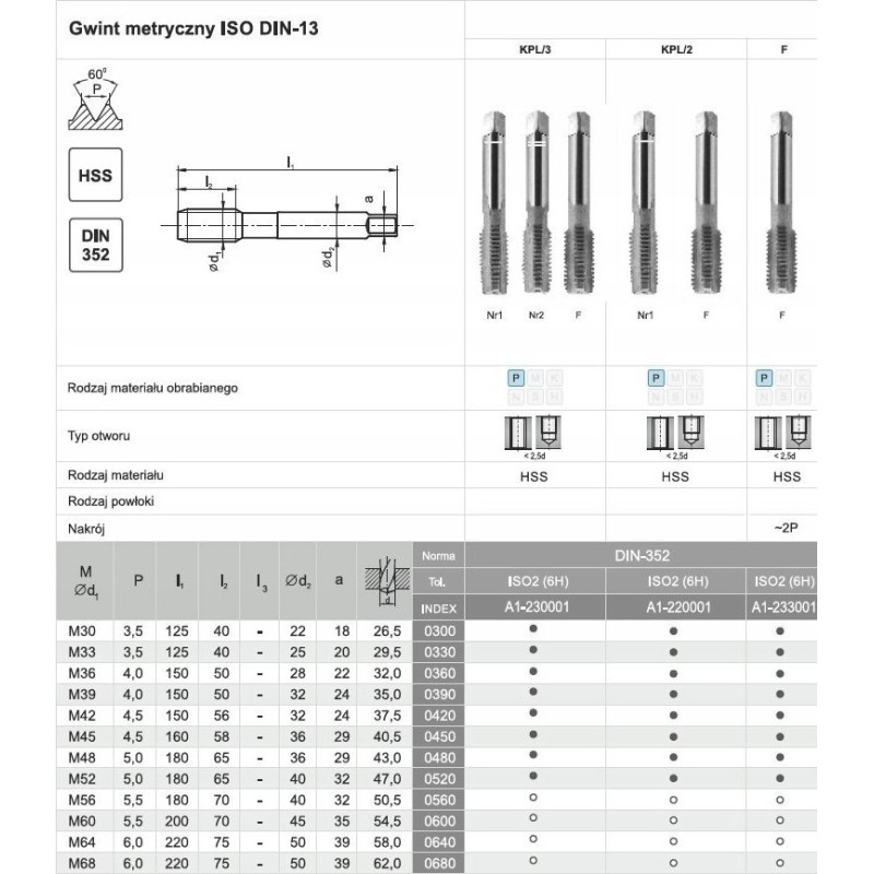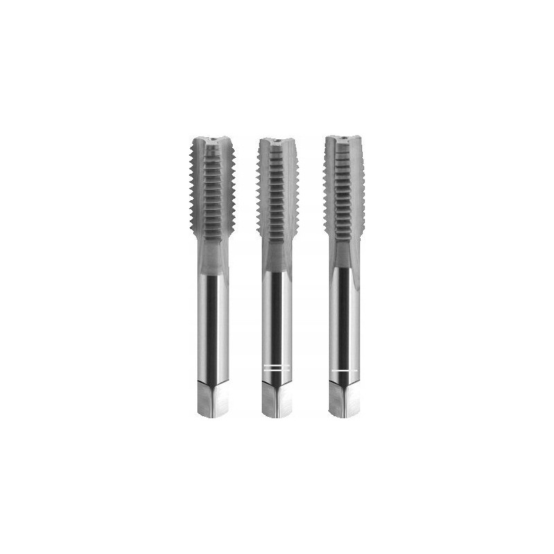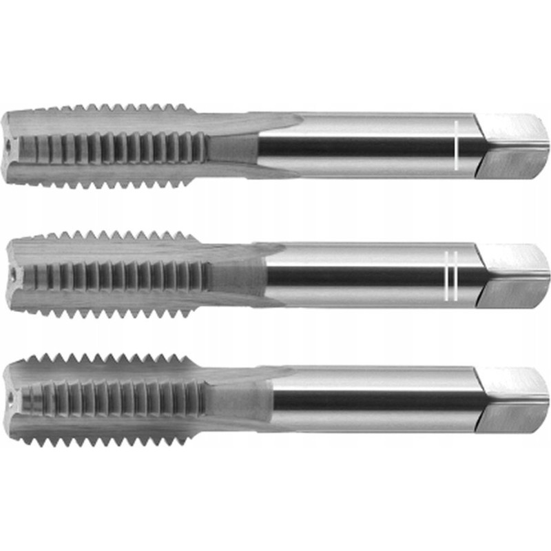 Universelle Handgewindebohrer für metrische und zöllige Gewinde sind in 2- und 3-teiligen Sätzen erhältlich. Die Werkzeuge sind aus hochlegiertem Schnellarbeitsstahl (HSS) gefertigt. Die Schnittlänge des Gewindebohrers für die Endbearbeitung beträgt ca. 2xP.