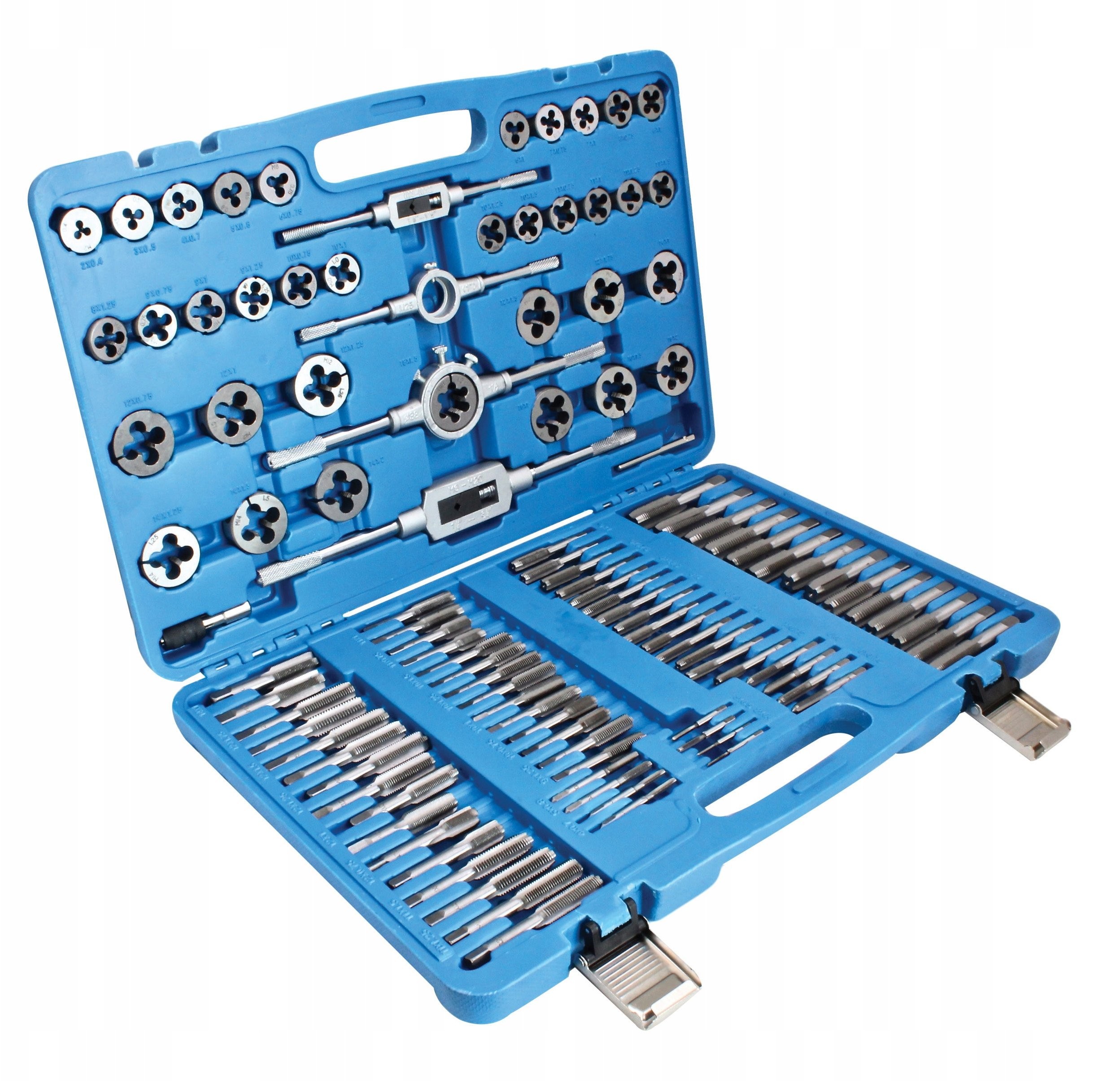 - Gewindebohrergrößen (je 2 Stück): M2x0,4, M3x0,5, M4x0,7, M5x0,8, M6x0,75, M6x1, M7x0,75, M7x1, M8x0,75, M8x1, M8x1,25, M9x0,75, M9x1, M9x1,25, M10x0,75, M10x1, M10x1,25, M10x1,5, M11x0,75, M11x1, M11x1,5, M12x1, M12x1,5, M12x1,75, M14x1, M14x1,25, M14x1,5, M14x2, M16x1, M16x1,25, M16x2, M18x1,5