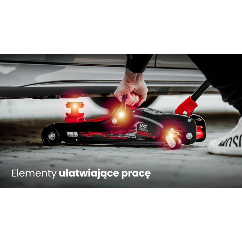 Der Wagenheber kann mit Fahrzeugen mit einem Gewicht von bis zu 2500 kg arbeiten, d. h. er bewältigt die meisten PKWs;