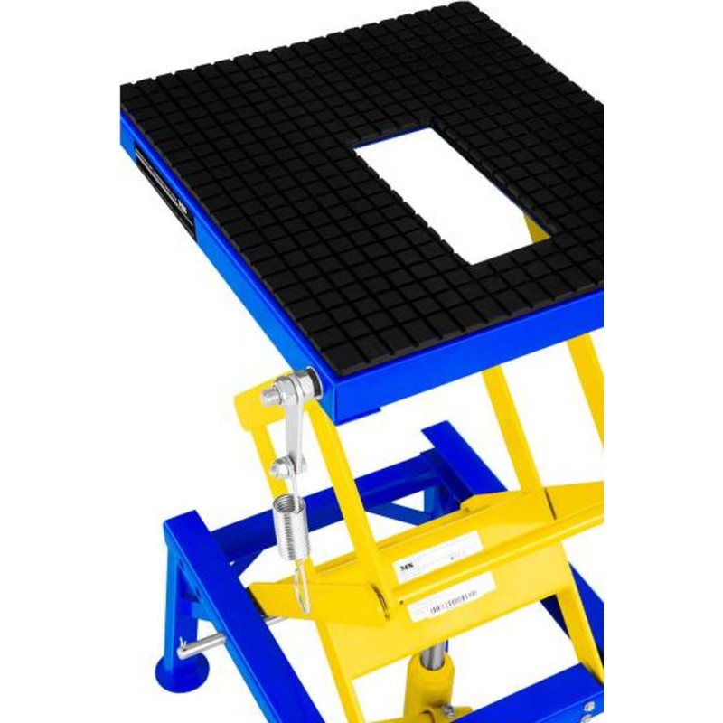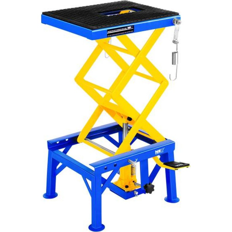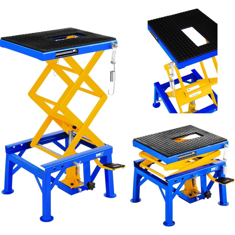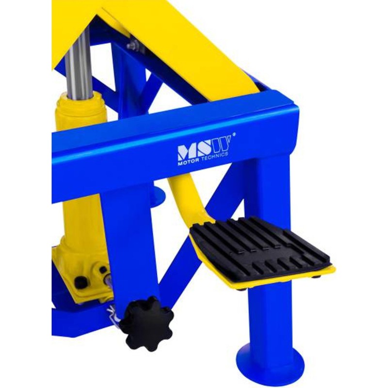 Der Motorradheber der Marke MSW ist für den Einsatz in professionellen Motorradwerkstätten, Reparaturbetrieben und Werkstätten vorgesehen. Er eignet sich auch für die Garage eines Motorradliebhabers. Er wurde zum Anheben (im Bereich von 350 bis 870 mm) und Abstützen von Motorrädern mit einem Gesamtgewicht von bis zu 135 kg entwickelt, also von leichten Maschinen wie Enduro-, Cross- und Rollermodellen. Das Modell MSW-MHB-135 kann auch zum Anheben von Bauteilen größerer Fahrzeuge verwendet werden: Kraftstofftanks, Schwingarme und Achsen. Das Anheben erfolgt über ein Fußpedal, das Absenken über einen Drehknopf.
