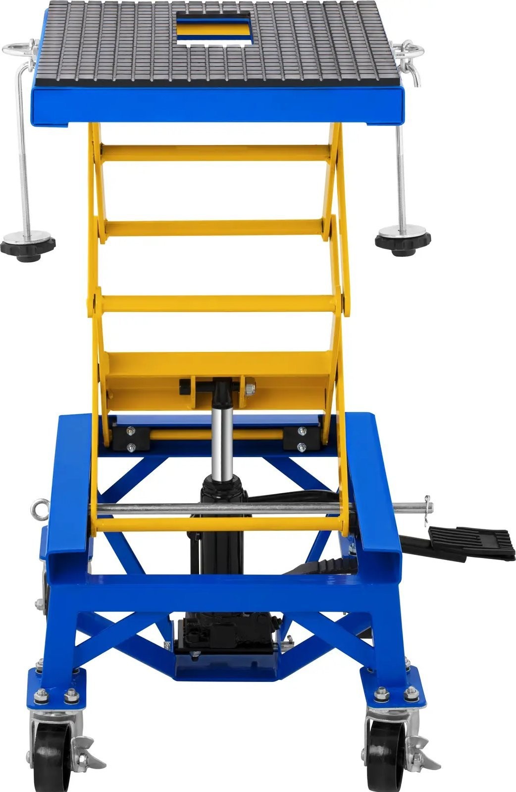 und bietet ausreichend Platz, um Werkzeuge griffbereit abzulegen. Die vier Beine der soliden Stahlkonstruktion sind mit vier Rollen mit Feststellbremsen ausgestattet und sorgen für einen sicheren Stand. Das Motorrad wird mit Spanngurten und U-förmigen Ösen an der Plattform befestigt. Anschließend lässt sich das Fahrzeug mühelos auf die gewünschte Arbeitshöhe anheben. Dank der Rollen lässt sich der Motorradheber bequem nutzen und leicht an jeden beliebigen Ort verschieben. Ein Fußpedal ermöglicht die einfache Bedienung des Geräts. Die Plattform lässt sich auf eine Höhe von 35 bis 87 cm