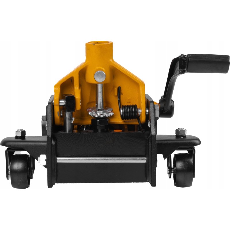 Das Gerät ist mit vier Rädern ausgestattet. Zwei davon sind lenkbar, die anderen beiden feststehend. Diese Konfiguration ermöglicht es, den Wagenheber präzise am Fahrgestell auszurichten, was die Arbeit rund um das Auto erheblich erleichtert ⏳