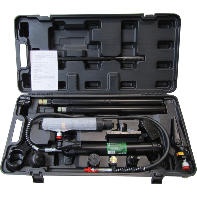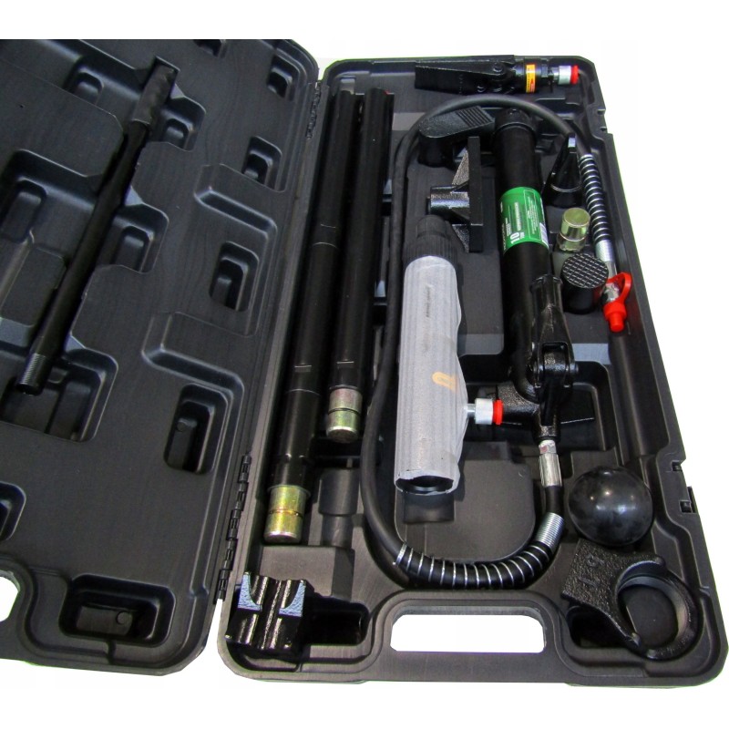 Das Set umfasst eine Hydraulikpumpe, Zylinder, Verlängerungen und gebogene Aufsätze. Es kann zusätzlich mit einem Hydraulikzylinder mit umgekehrter Wirkung und Befestigungsaufsätzen ergänzt werden.