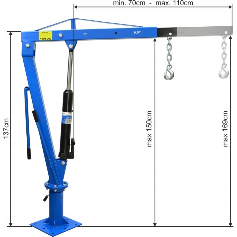 - Tragkraft je nach Ausladung des Arms: 500 / 1000 kg