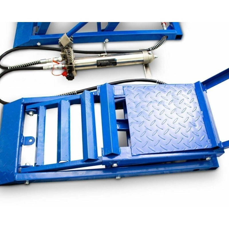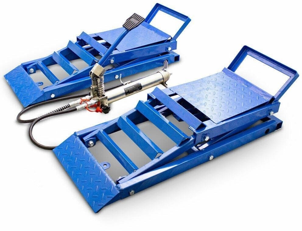 Hydraulische Rampen für Wartungs-, Service- und Reparaturarbeiten. Diese Rampen mit Hydraulikheberfunktion sind das ideale Werkstattzubehör. Der Heber wird mithilfe einer Hydraulikpumpe auf die gewünschte Höhe eingestellt – einfach mit dem Fußpedal pumpen! Dank der langen Schläuche kann die Hydraulikpumpe an jedem beliebigen Ort aufgestellt werden.