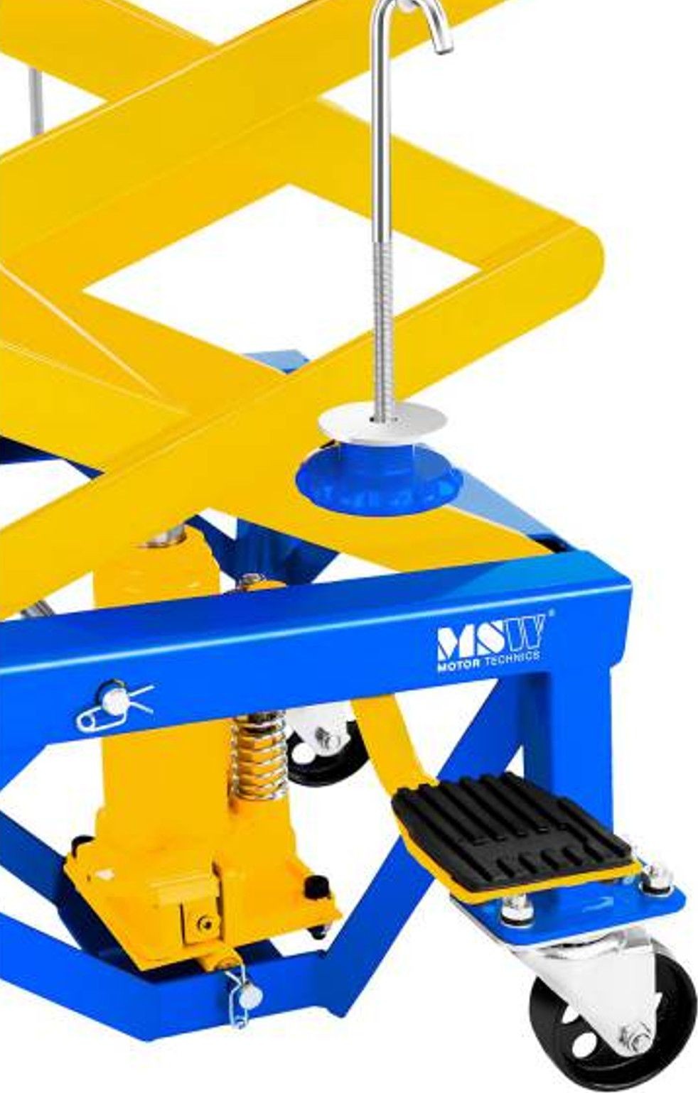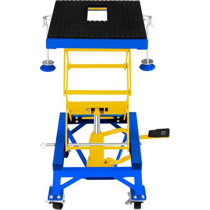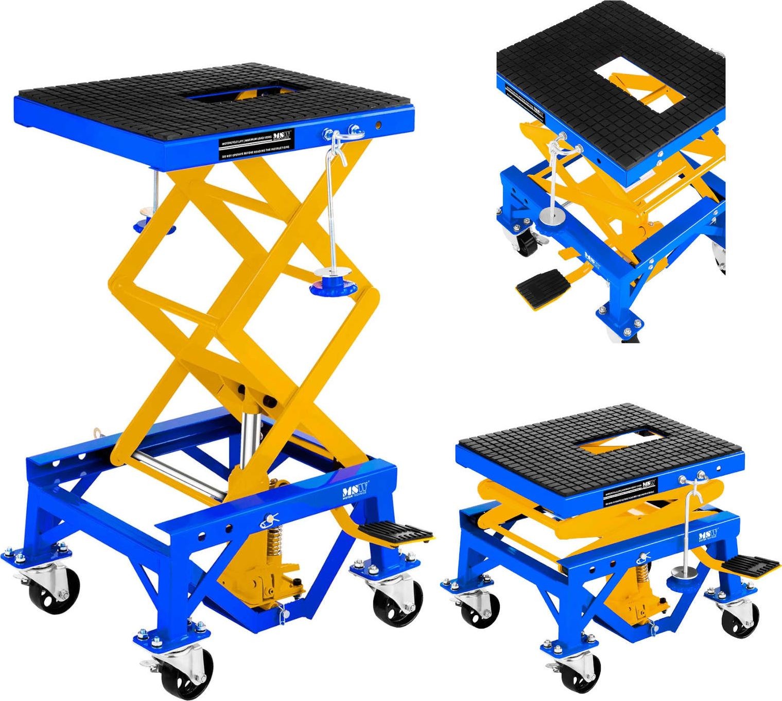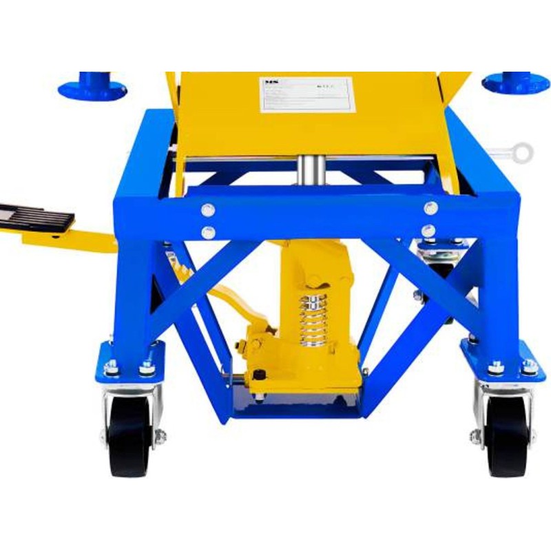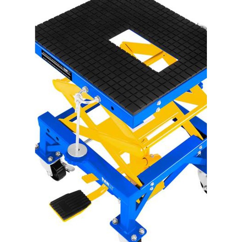 Der Motorradheber der Marke MSW ist für den Einsatz in professionellen Motorradwerkstätten, Reparaturbetrieben und Werkstätten vorgesehen. Er eignet sich auch für die Garage eines Motorradliebhabers. Er wurde zum Anheben (im Bereich von 350 bis 870 mm) und Abstützen von Motorrädern mit einem Gesamtgewicht von bis zu 135 kg entwickelt, also von leichten Maschinen wie Enduro-, Cross- und Rollermodellen. Das Modell MSW-MHB-135 kann auch zum Anheben von Bauteilen größerer Fahrzeuge verwendet werden: Kraftstofftanks, Schwingarme und Achsen. Das Anheben erfolgt über ein Fußpedal, das Absenken über einen Drehknopf.