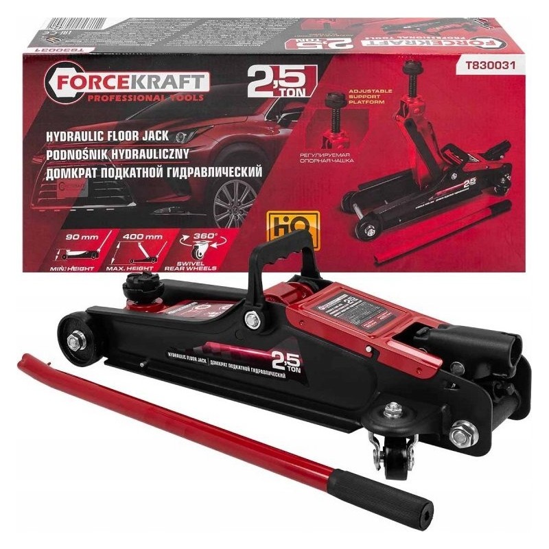 Der Hydraulikheber mit einer Tragkraft von 2,5 Tonnen (2500 kg) der Marke Forcekraft ist ein zuverlässiges Werkzeug, das sich in jeder Werkstatt bewährt. Seine flache Bauweise macht ihn zur idealen Lösung für die Arbeit an PKWs und gewährleistet gleichzeitig Komfort und Sicherheit bei der Nutzung.