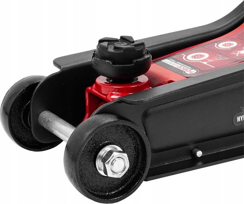 Die robusten Metallrollen des Hebers erleichtern nicht nur das Bewegen, sondern gewährleisten auch eine langlebige Leistungsfähigkeit. Durch den großen Durchmesser der Rollen eignet sich der Heber sogar für unebene Oberflächen, was ihn zu einem vielseitigen Werkzeug in jeder Werkstatt macht.
