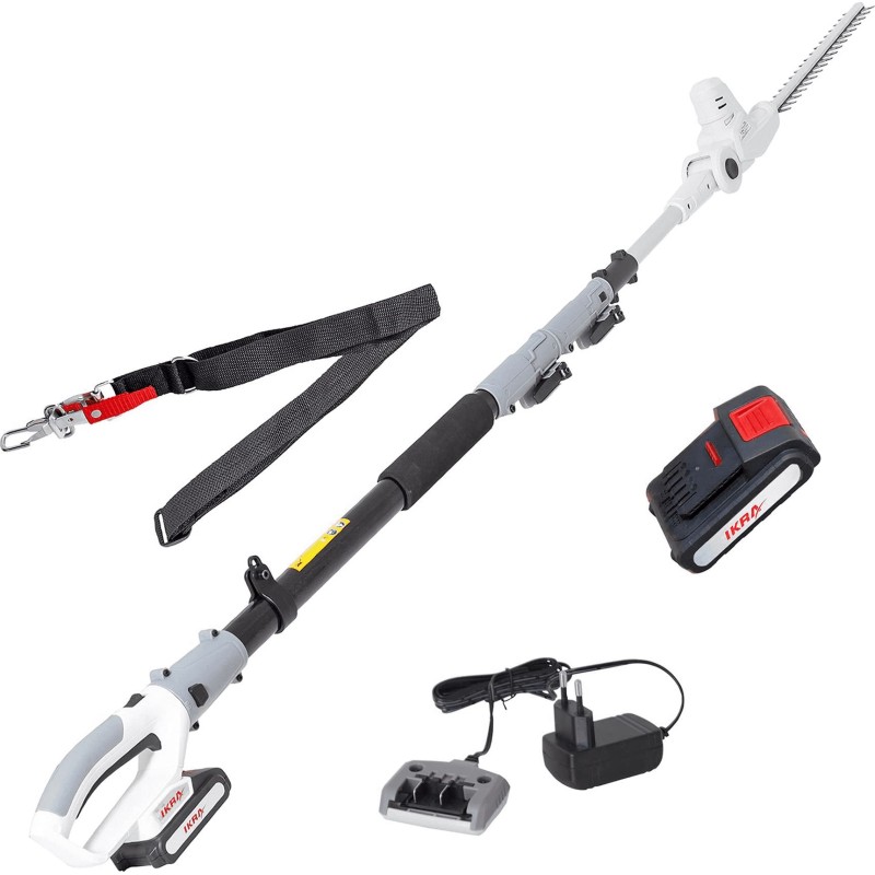 Heckenschere IKRA ICPH 2040 Leichte Heckenschere mit Teleskopausleger der Marke IKRA, angetrieben durch einen im Lieferumfang enthaltenen 20-V-Lithium-Ionen-Akku mit 2,0 Ah, zum Schneiden von Hecken mit beträchtlicher Höhe und in jedem Winkel, ohne dass eine Leiter erforderlich ist. Schnittlänge 43,5 cm, Zahnabstand 18 mm, Neigungsverstellung des Schneidkopfes: 7 Positionen von +90° bis -25°. Der drehbare Griff ermöglicht ergonomisches horizontales und vertikales Schneiden. Gerätelänge: 2,20 – 2,75 m, stufenlose Höhenverstellung, Arbeitshöhe bis zu 4 m, inklusive Schultergurt. Das geringe Gewicht (4 kg) sorgt für komfortables und sicheres Arbeiten an schwer zugänglichen, hohen Stellen.