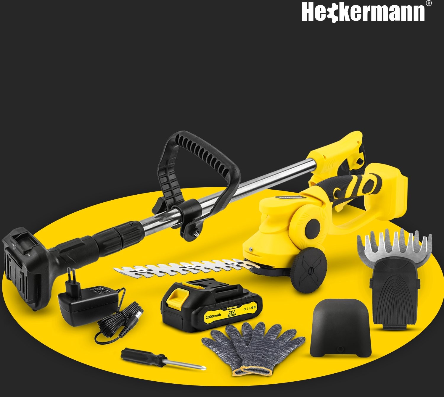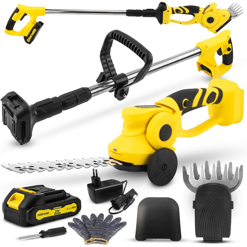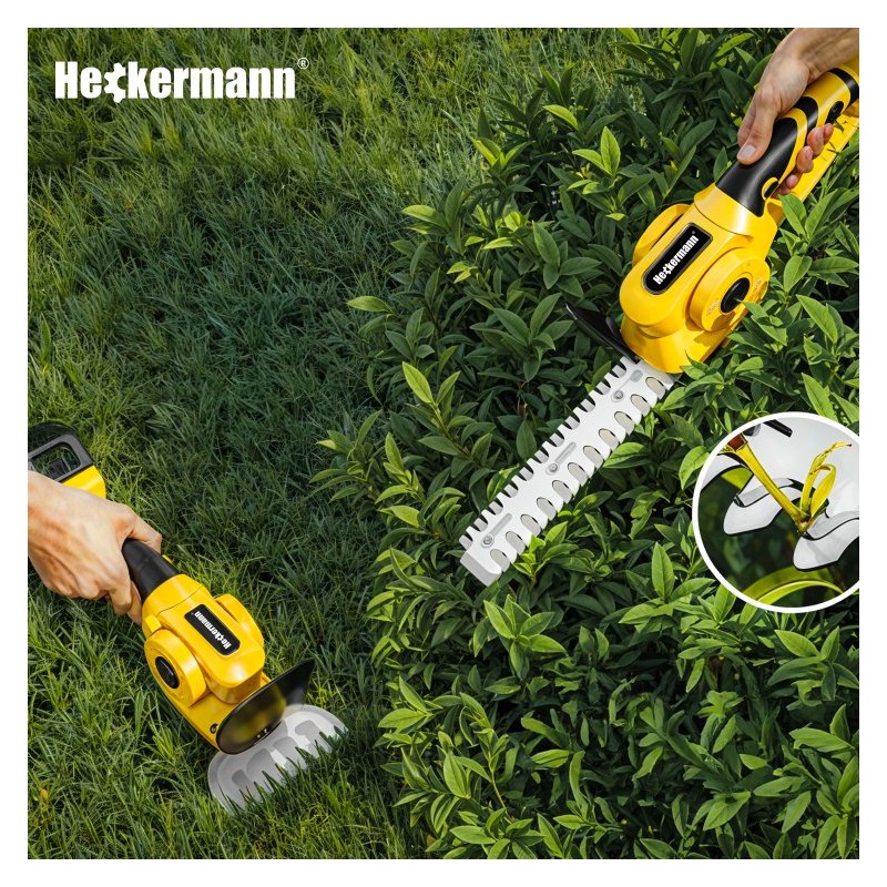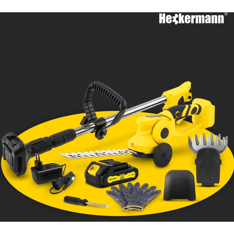 - Im Lieferumfang enthalten: Schere, Teleskopstiel, Grasmesser, Heckenschermesser, Akku, Ladegerät, Schutzkappen-Set, Schutzhandschuhe