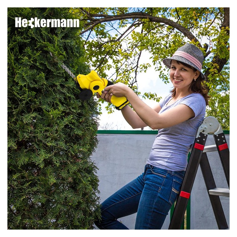 Die Heckenschere mit Ausleger eignet sich zum Schneiden sowohl höherer als auch niedrigerer Hecken vom Boden aus. Dank des Auslegers erreichen Sie auch sehr hohe Zweige und Blätter, die das ästhetische Erscheinungsbild Ihrer Hecke beeinträchtigen. Der ausziehbare Rahmen erhöht den Arbeitskomfort und reduziert den Zeitaufwand für das Heckenschneiden auf ein Minimum.