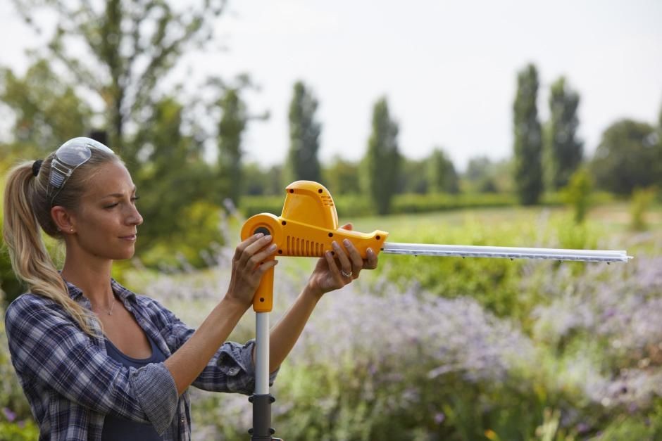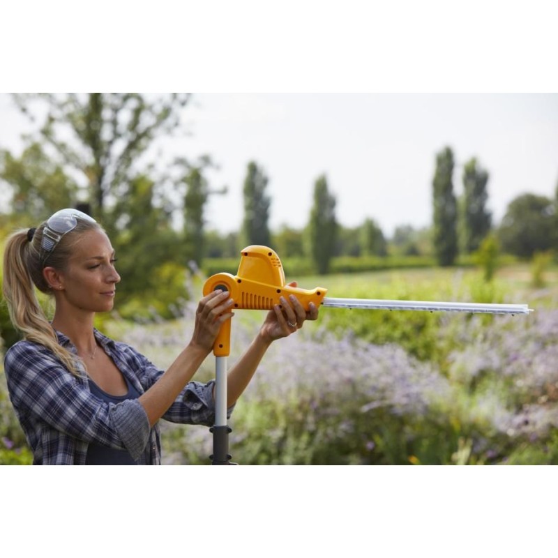 Die Heckenschere mit Ausleger eignet sich zum Schneiden sowohl höherer als auch niedrigerer Hecken vom Boden aus. Dank des Auslegers erreichen Sie auch sehr hohe Zweige und Blätter, die das ästhetische Erscheinungsbild Ihrer Hecke beeinträchtigen. Der ausziehbare Rahmen erhöht den Arbeitskomfort und reduziert den Zeitaufwand für das Heckenschneiden auf ein Minimum.