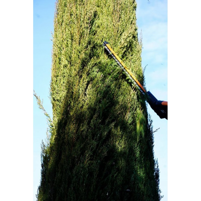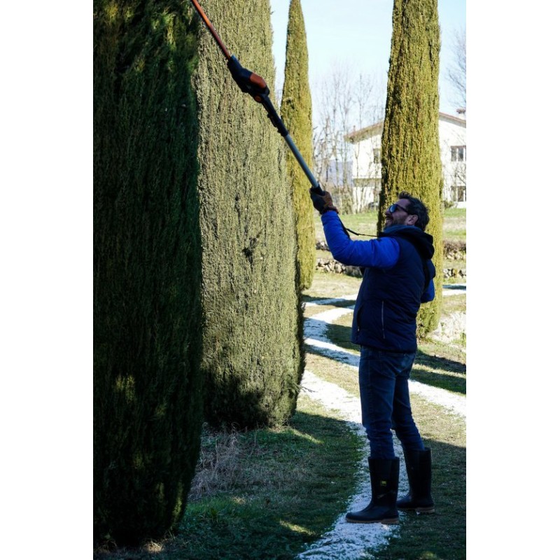 Die präzisen Akku-Heckenscheren von Worx sind mit einer 45 cm langen Klinge ausgestattet, wodurch sie sich auch für die Arbeit an größeren Sträuchern eignen. Die beidseitige Klinge beschleunigt die Arbeit und erzeugt weniger Vibrationen. Der verstellbare, drehbare hintere Griff hilft dabei, den bequemsten Schnittwinkel einzustellen. Das geringe Gewicht von 3,6kg und das schlanke Design erhöhen den Arbeitskomfort erheblich. Die robuste Schutzabdeckung am vorderen Griff erhöht die Sicherheit und schützt vor scharfen Laubresten. Der Teleskopausleger ermöglicht Arbeiten in Höhen von bis zu 3,8 m.