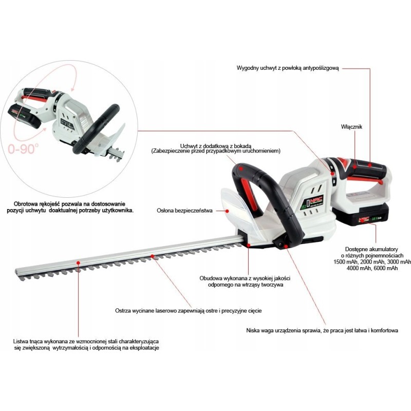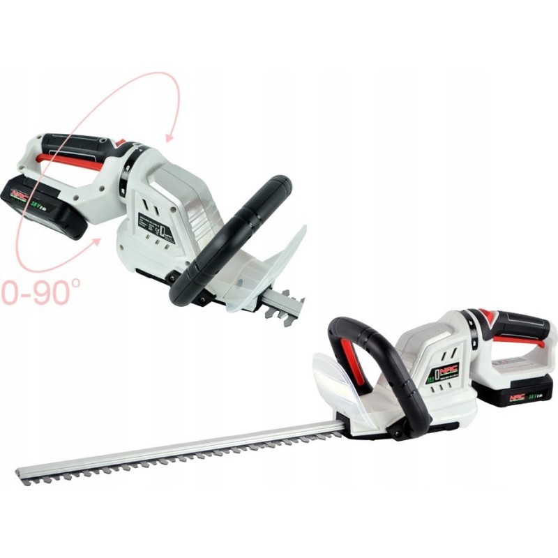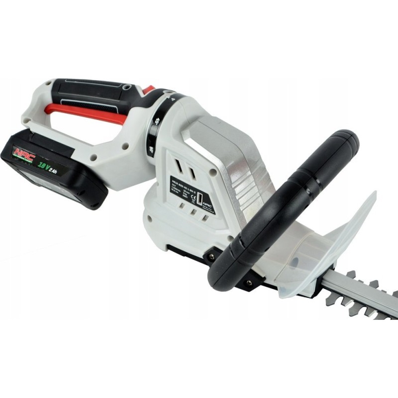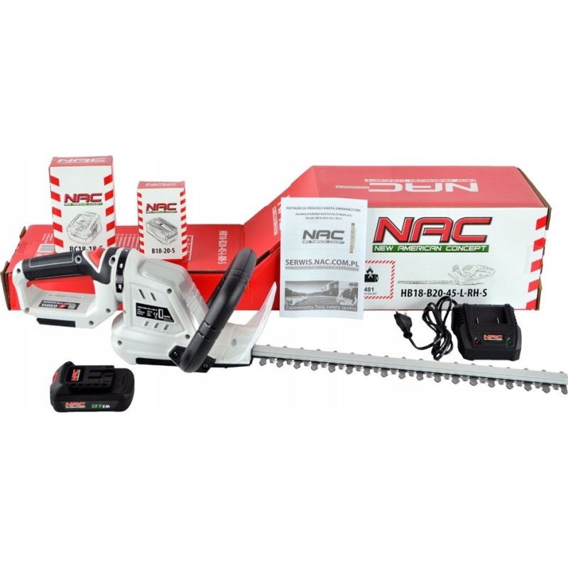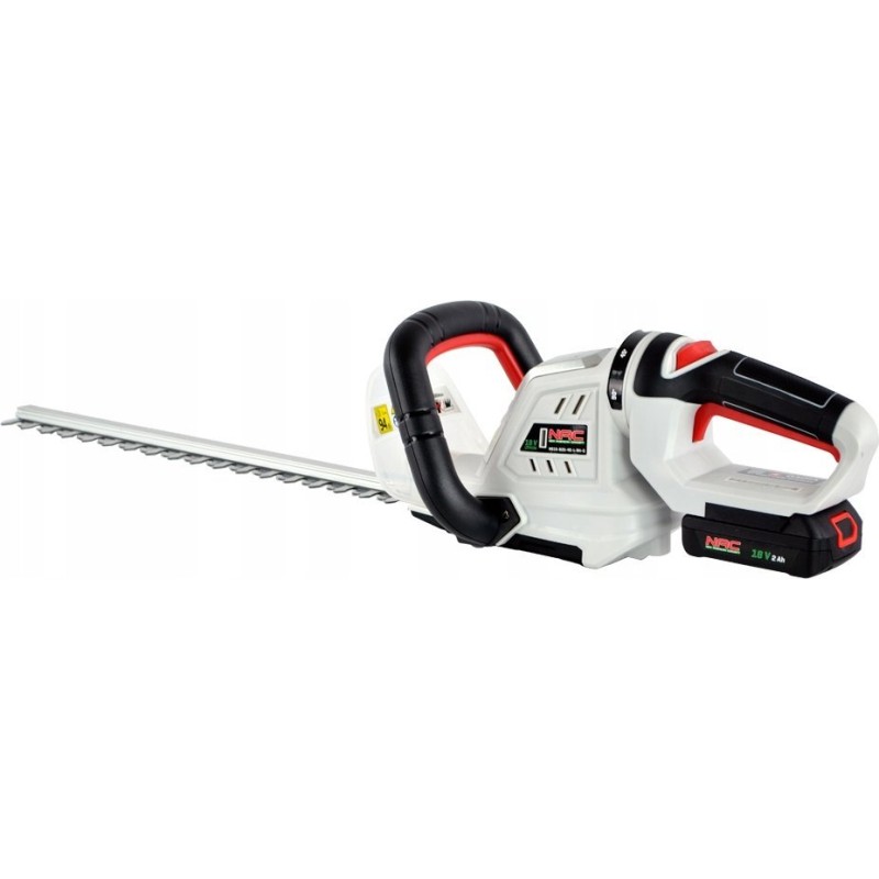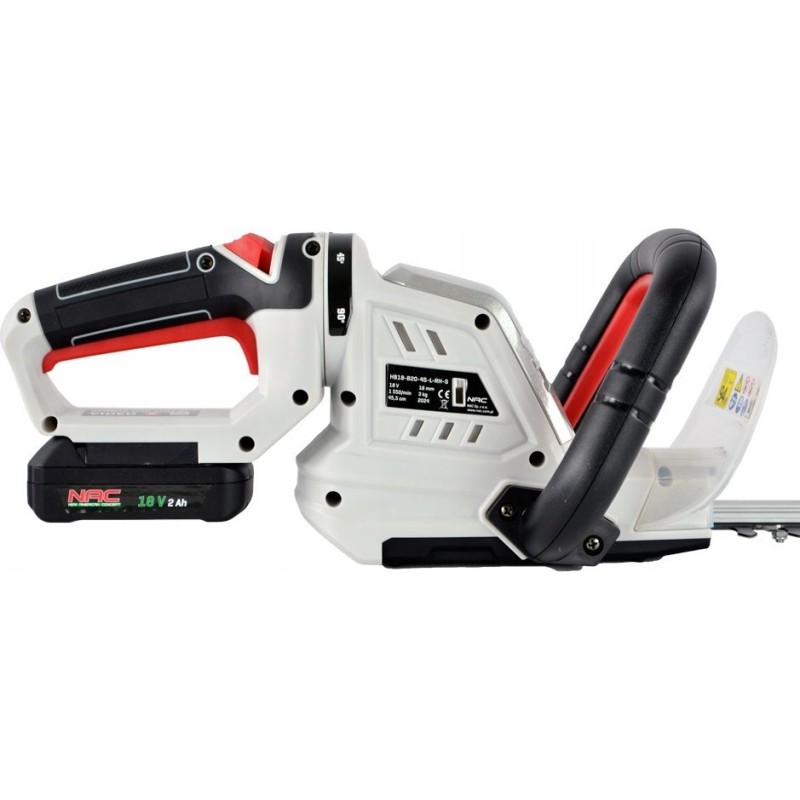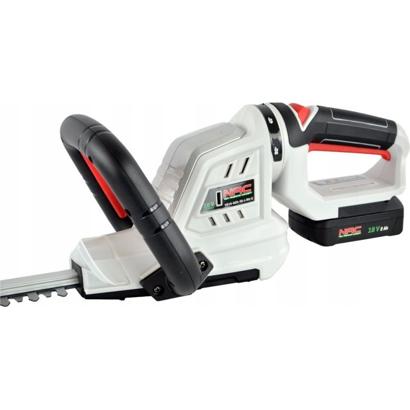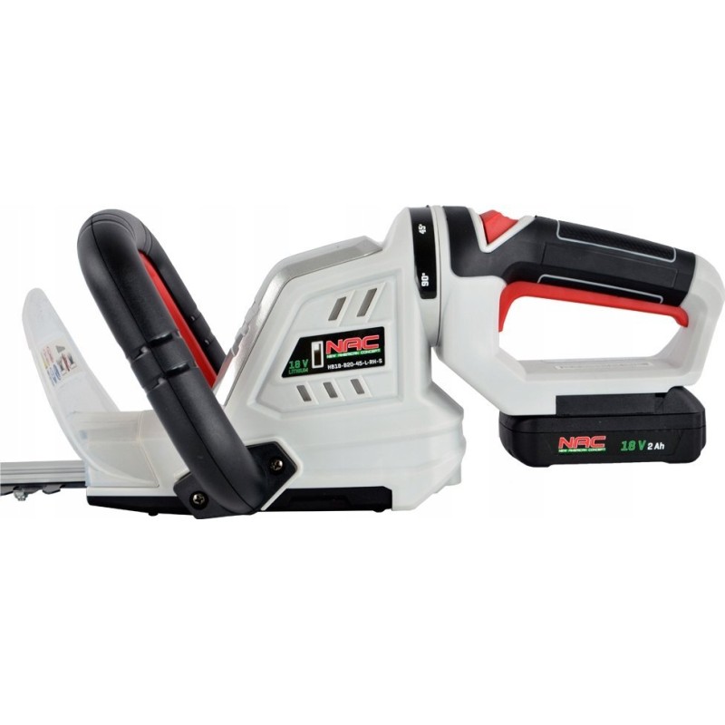 Akku-Heckenschere und Strauchschere der Firma NAC. Das Modell mit der Bezeichnung HB18-B20-45-L-RH-S ist mit einem modernen Lithium-Ionen-Akku mit einer Spannung von 18 V und einer erhöhten Kapazität von 2 Ah ausgestattet.