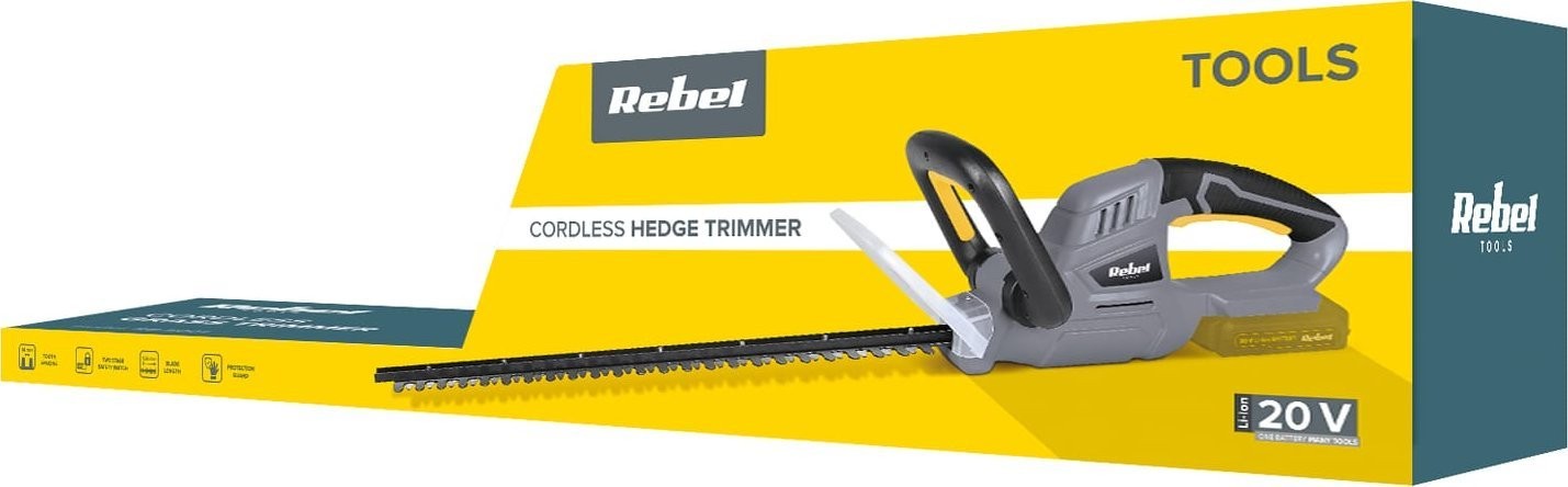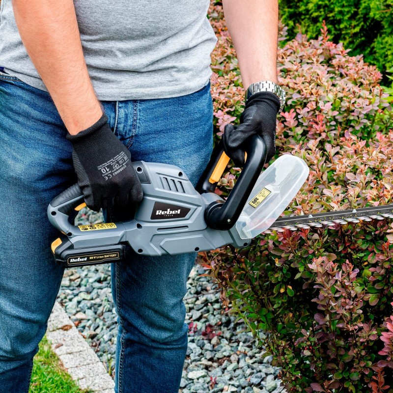 Die Rebel Tools-Heckenscheren sind mit einem ergonomischen Griff und einem Sicherheitsschalter ausgestattet, was Komfort und Kontrolle bei der Arbeit gewährleistet. Der vordere Griff erleichtert zusätzlich die Führung des Geräts, selbst bei längerem Gebrauch. Für vollen Bedienkomfort verfügen die Heckenscheren über eine Akkuladestandsanzeige und eine Ladeanzeige, was eine bessere Verwaltung der Arbeits- und Ladezeiten ermöglicht.