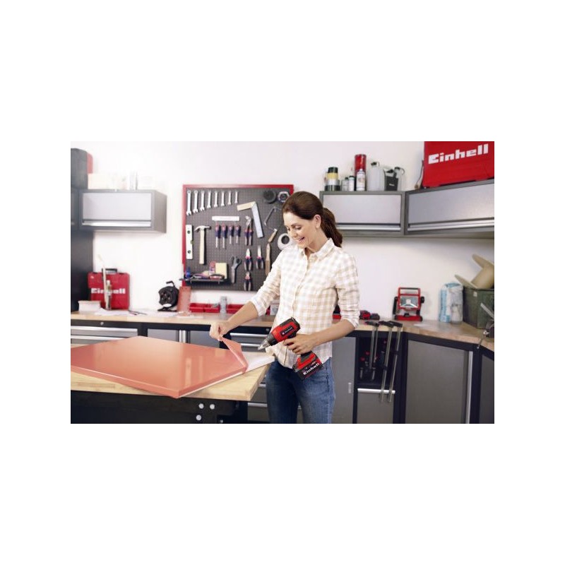 TE-HA 18 Li Solo Der Heißluftfön der Marke Einhell gehört zur umfangreichen Familie der Akku-Werkzeuge im Power X-Change-System für Haus und Garten. Das Gerät bietet Heimwerkern eine gute Unterstützung bei Arbeiten wie dem Entfernen von altem Lack und Farbe, der Montage von Kunststoffrohren und vielem mehr. Es verfügt über zwei Leistungsstufen, um Temperatur und Luftgeschwindigkeit an die jeweiligen Anforderungen anzupassen. Das Gerät ist mit einem mechanischen Düsenauswerfer ausgestattet, der ein einfaches Entfernen der Düsen ermöglicht.