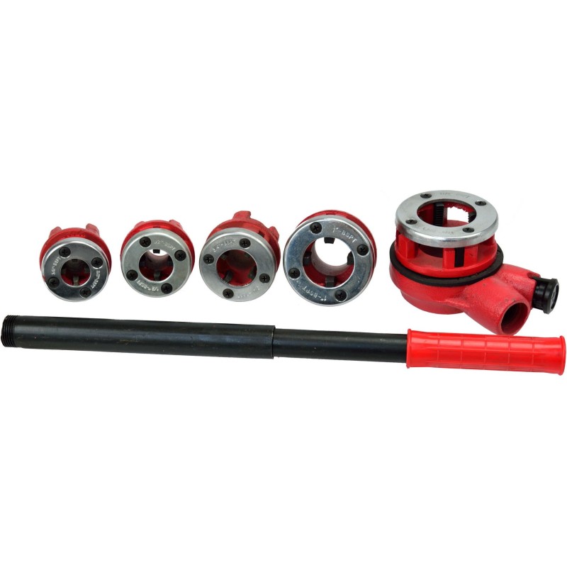 Hydraulischer Gewindeschneider für Rohre, 5-teilig, Gewindeschneidbacken 3/8" – 1,1/4" Hydraulischer Gewindeschneider für Rohre im Set mit 5 Gewindeschneidbacken. Das Gerät dient zum Gewindeschneiden von Rohren und Formstücken. Es findet sowohl bei Renovierungsarbeiten als auch auf der Baustelle Anwendung. Die Gewindeschneidezähne bestehen aus CrV-Legierungsstahl mit einer Härte von HRC 58–62. Gusseisernes Gehäuse der Gewindeschneidbacken. Produktmerkmale: zum Gewindeschneiden von Rohren und Formstücken Schneidbacken aus Chrom-Vanadium-Legierungsstahl mit einer Härte von HRC 58–62 robuste Gusseisenkonstruktion 5 Gewindeschneidbacken im Set Griff mit Verlängerung