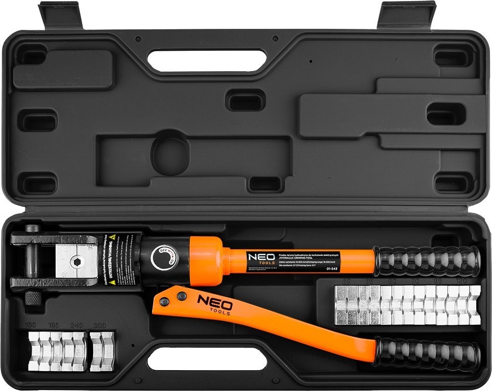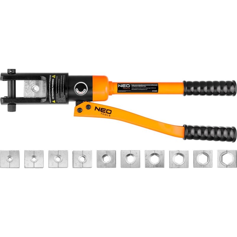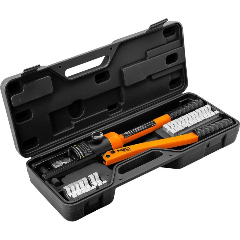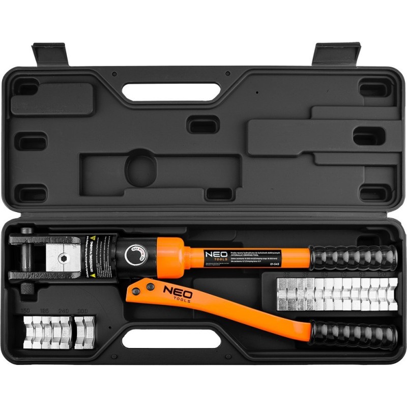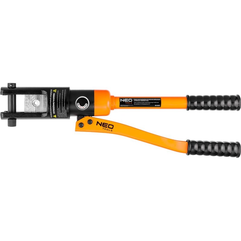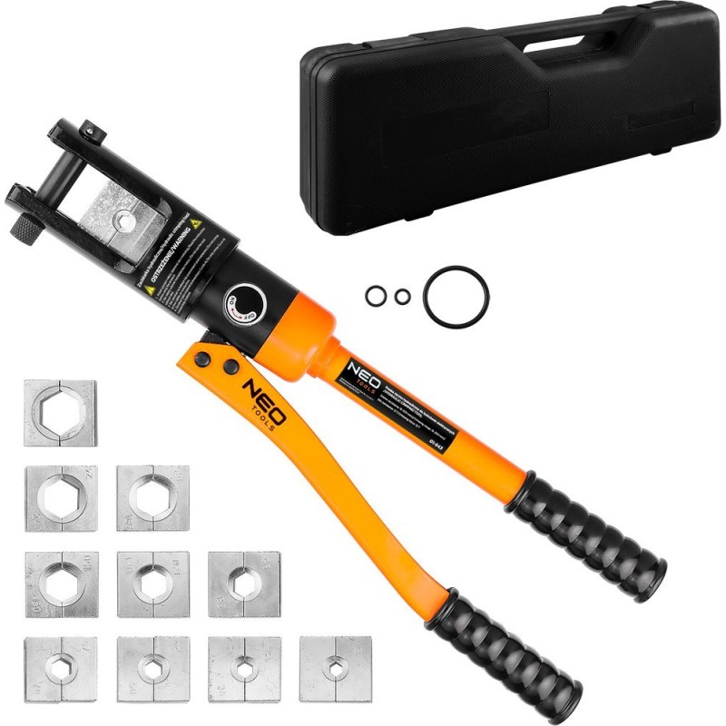 Hydraulische Handpresse zum Crimpen von elektrischen Kabelschuhen und Stahlseilen, Größe der Pressbacken: 16, 25, 35, 50, 70, 95, 120, 150, 185, 240, 300 mm, Länge 480 mm, Sechskant-Klemmtyp, Presskraft 12 Tonnen, Hub 20 mm, Gehäuse aus Kohlenstoffstahl, ausgestattet mit: geteilter Pressmatrize, drehbarem Zylinderkopf, Anschlagbolzen zur Arretierung der Matrizen, Kolben, Hauptventil des Zylinders, ergonomischen Griffen, beweglichem Zylinderarm.