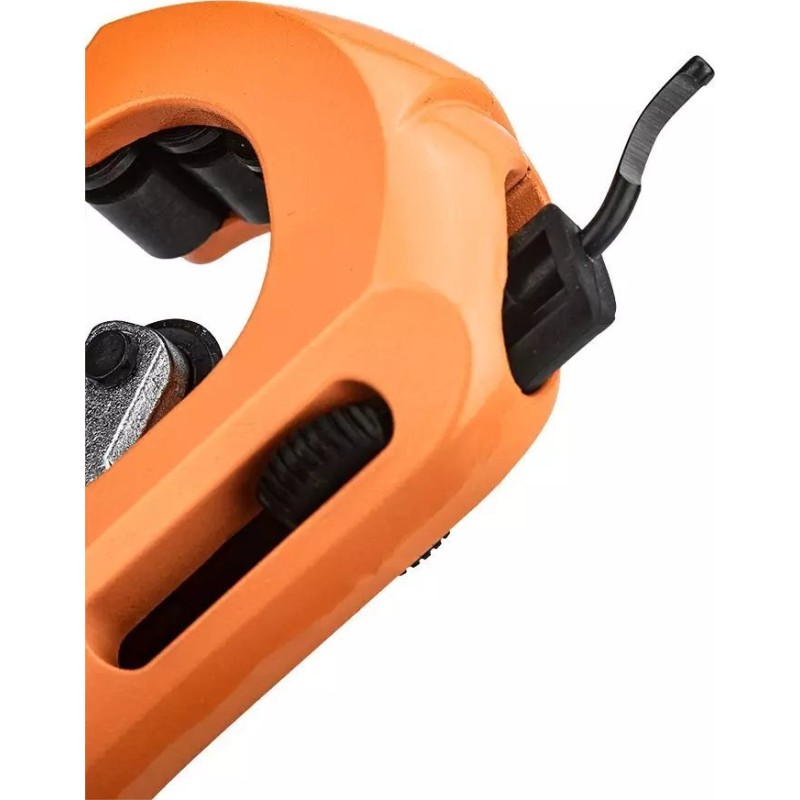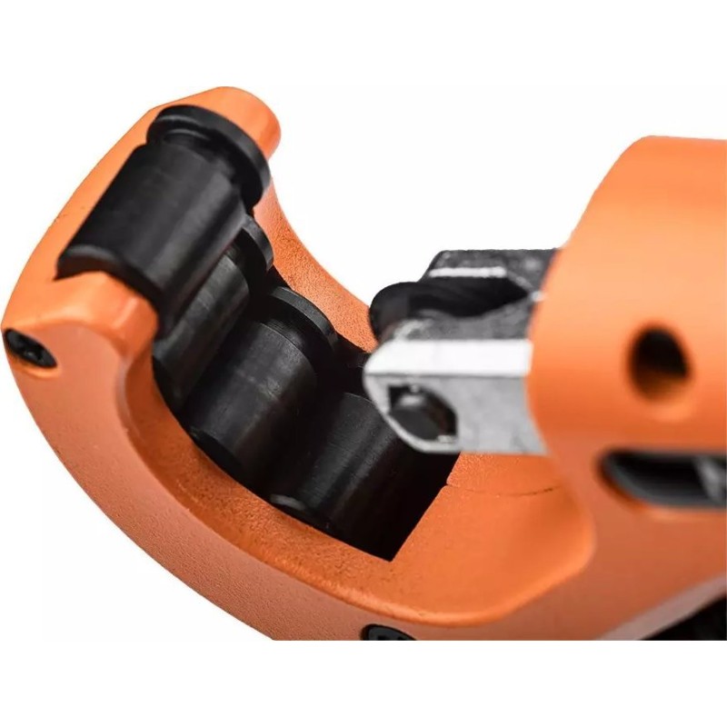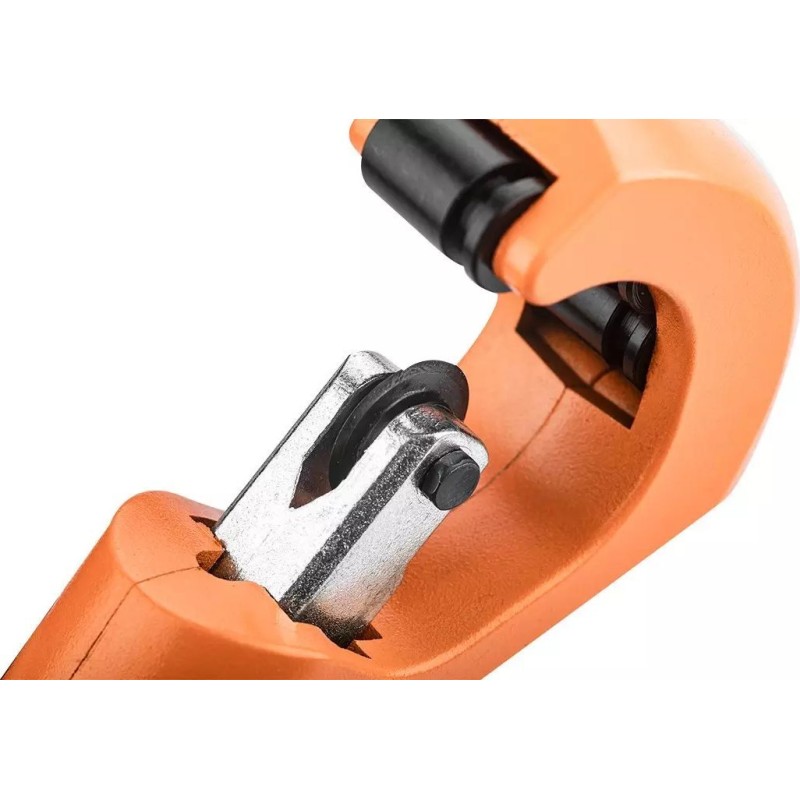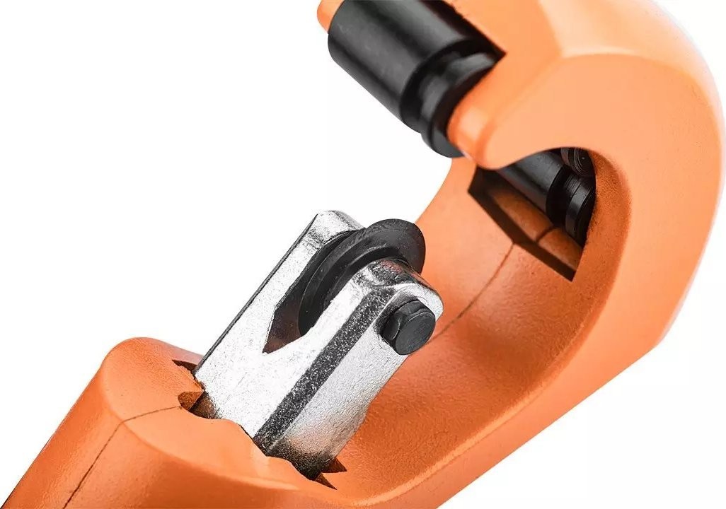 NEO-Rohrschneider für Kupfer- und Aluminiumrohre (Art.-Nr. 02-010) mit einem Schnittbereich von 3–35 mm. 4 Führungsrollen, mit Entgrater und Ersatzschneidrad im Drehknopf des Rohrschneiders. Das Schneidrad besteht aus hochwertigem legiertem Stahl mit einer Härte von 56–58 HRC. Die Qualität des Werkzeugs wird durch ein TÜV-Zertifikat und eine 25-jährige Herstellergarantie bestätigt. Die Marke NEO erfüllt die Erwartungen von Profis.