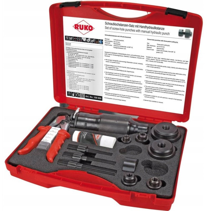 Das RUKO-Set besteht aus 12 Teilen, darunter ein handliches Hydraulikwerkzeug und sechs Ausbrecher mit unterschiedlichen Durchmessern, was es zur idealen Wahl für alle macht, die Wert auf Effizienz und einfache Handhabung legen.