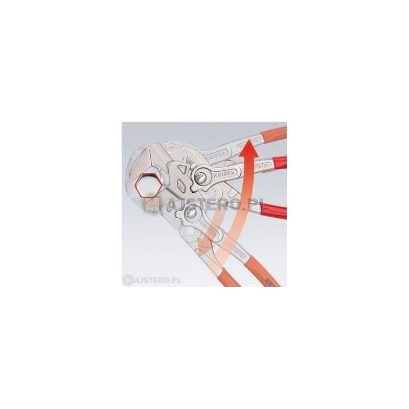 Zange und Schraubenschlüssel in einem Werkzeug. Professionelles Werkzeug von Knipex zum häufigen Greifen von Gegenständen unterschiedlicher Größe dank automatischer Verstellung. Ermöglicht die Montage von verchromten Sanitärarmaturen ohne Beschädigung der Oberflächen.
