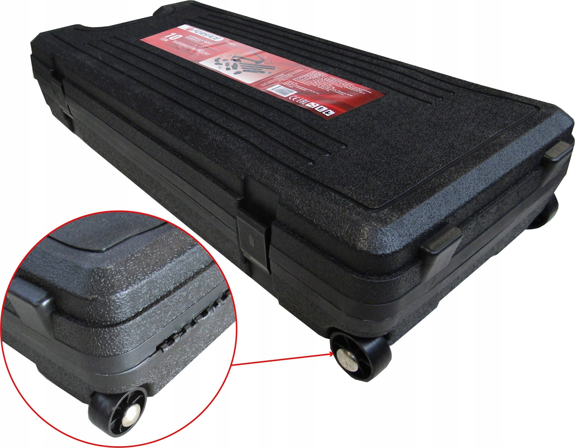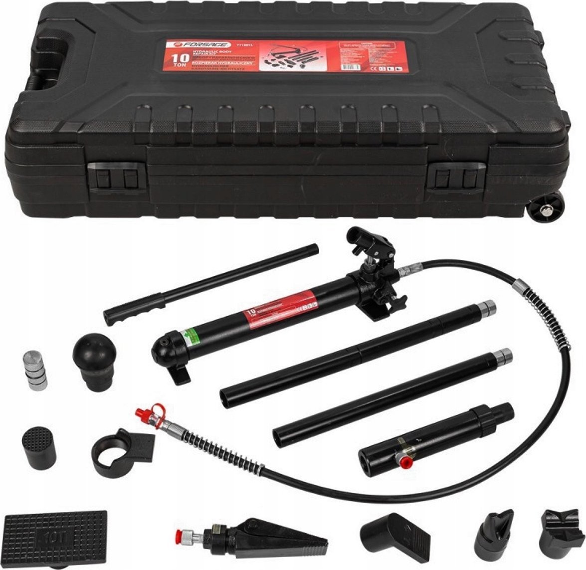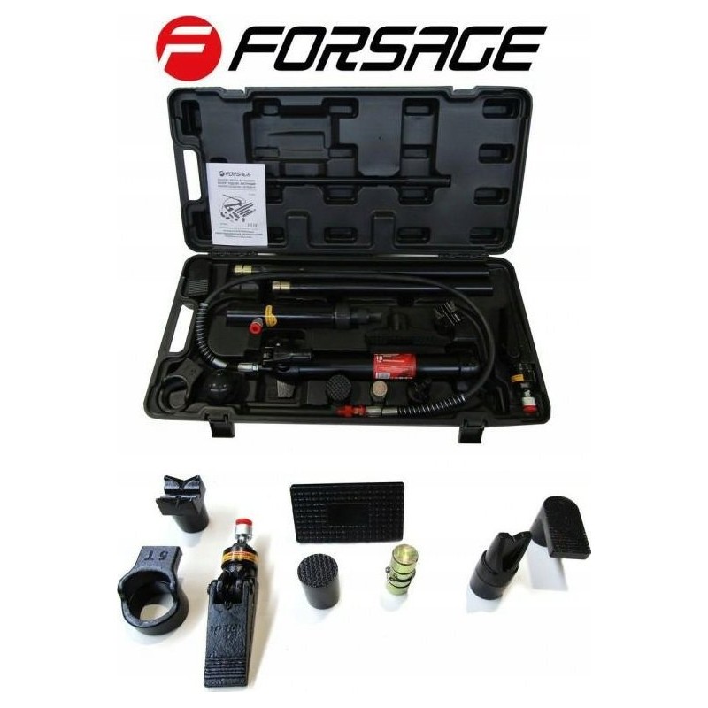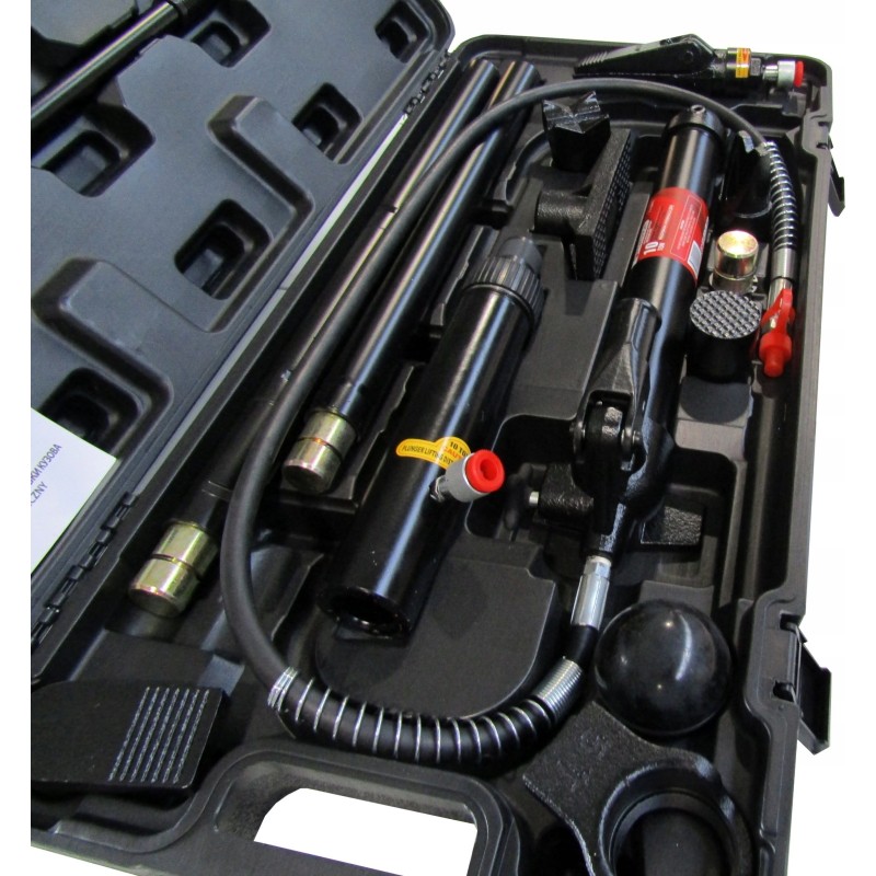 Das Set enthält eine Hydraulikpumpe, Zylinder, Verlängerungen und gebogene Aufsätze. Es kann zusätzlich mit einem Hydraulikzylinder mit umgekehrter Wirkung sowie Befestigungsaufsätzen ergänzt werden.