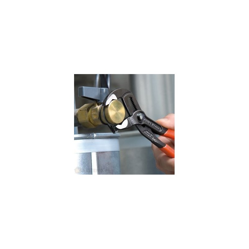 KNIPEX Cobra® – Rohrzangen der neuen Generation. Nie wieder zeitaufwändiges Einstellen der Backenöffnung auf die passende Größe. Einfach die obere Backe auf das zu greifende Objekt setzen, den Knopf drücken und die untere Backe zuziehen. So einfach ist das!