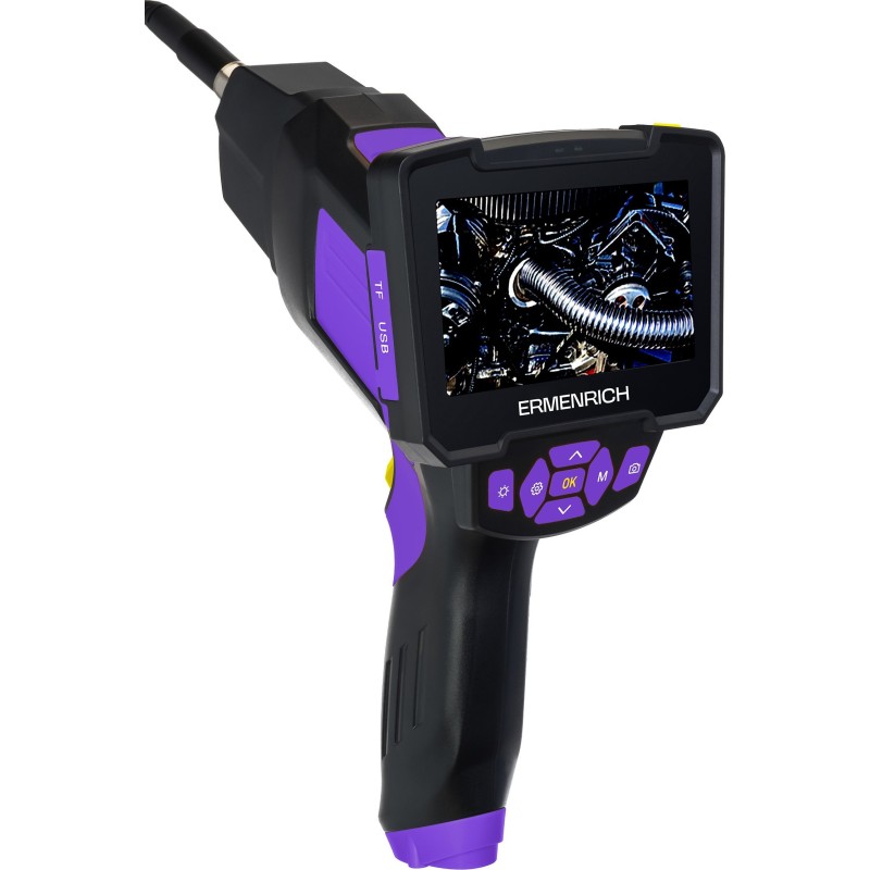 Die Inspektionskamera (Boreskop) Ermenrich Seek VE60 mit zwei HD-Kameras ermöglicht die Inspektion schwer zugänglicher Stellen sowie das Aufnehmen von Fotos und Videos. Das Gerät liefert eine gute Bildqualität: Die Frontkamera hat einen Blickwinkel von 70°, die Seitenkamera ebenfalls 70°. Beide Kameras sind mit LED-Beleuchtung ausgestattet. Das Boroskop ist ein unverzichtbares Werkzeug für die Inspektion schwer zugänglicher Stellen, z. B. zur Überprüfung des Zustands von Abflüssen oder Rohrleitungen, zur Begutachtung von Haushaltsgeräten oder zur Überprüfung des Zustands eines Automotors. Es kann auch zur Untersuchung von Zwischenwandkonstruktionen, Ladungen in Containern usw. verwendet werden.