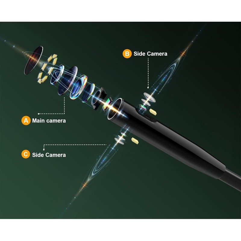 - ✅Großes 360°-Sichtfeld mit drei Objektiven: Die Endoskopkamera ES520 verfügt über drei Objektive, was ein breites 360°-Sichtfeld ermöglicht. Zudem sorgen zwei HD-Kameras an den Seiten der Hauptkamera für eine bessere Sicht auf den linken und rechten Bereich. Sie können zwischen diesen drei Objektiven wechseln, um bessere Beobachtungsergebnisse zu erzielen.