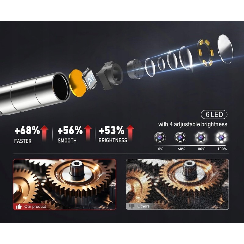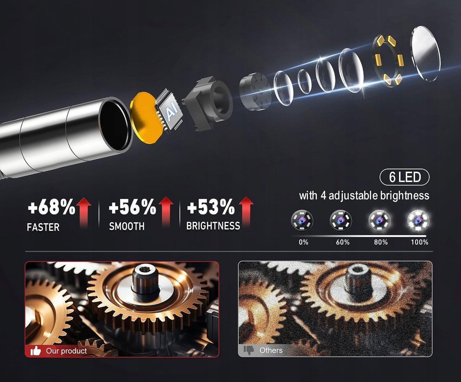 Die Ralcam Endoskopkamera F606B ist ein modernes Inspektionsgerät, das eine präzise Untersuchung schwer zugänglicher Stellen ermöglicht. Dank des schlanken Kopfes mit einem Durchmesser von 6,2 mm und des um 360° drehbaren Kopfes ist die Kamera die perfekte Lösung für Autoreparaturen, Rohrinspektionen und die Überprüfung elektrischer Anlagen.
