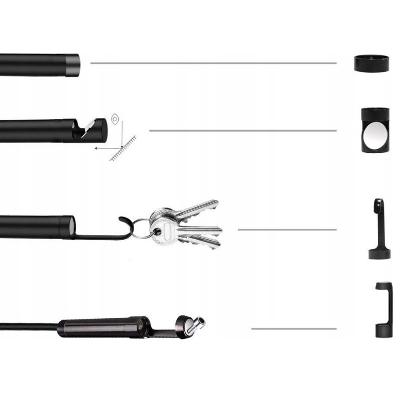 Neues, innovatives, vollständig wasserdichtes Endoskop mit 6 LEDs mit einstellbarer Leuchtstärke. Das Gerät verfügt über ein sehr flexibles und robustes Kabel, erhältlich mit Magnet-, Haken- und Spiegelaufsatz. Die Kamera hat einen Blickwinkel von 70 Grad. Aufnahmen und Live-Ansicht an schwer zugänglichen Stellen sind nun kein Problem mehr.
