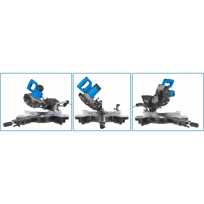 Dank der beweglichen Basis aus robustem Aluminiumdruckguss ermöglicht das Gerät Gehrungsschnitte in jedem beliebigen Winkel im Bereich von -45°/ 0 / 45°. Die zusätzliche Neigungsverstellung des Sägeblatts ermöglicht das Schneiden von Material in einem Winkel von 0° bis 45°.