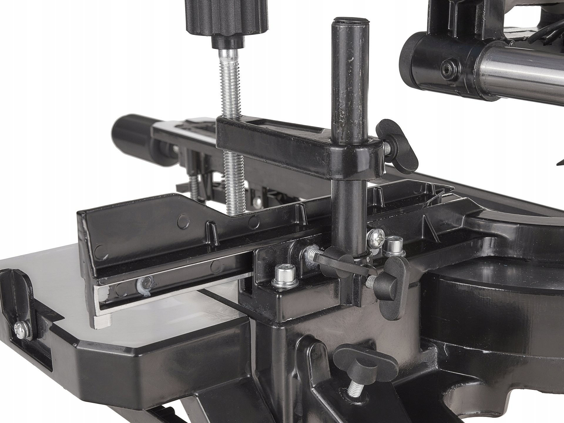 Ein weiterer Vorteil der Säge ist die ausziehbare Arbeitsplatte, die das Arbeiten mit Materialien unterschiedlicher Größe ermöglicht. Die Säge verfügt über eine Klemme, mit der das zu schneidende Material sicher fixiert werden kann.