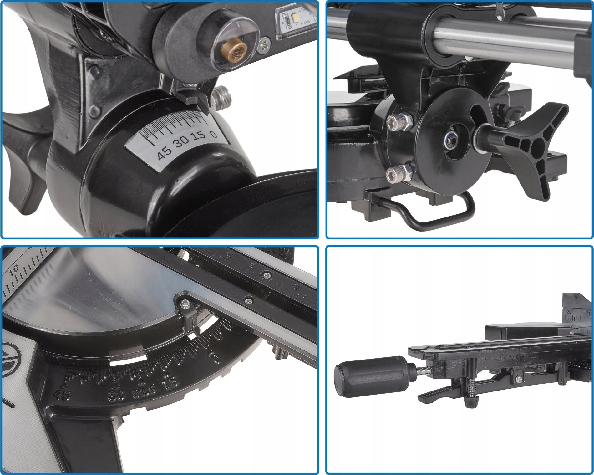 - Der Vorschub ermöglicht einen Schnitt von 340 mm bei einer Basisposition von 0°, bei einer Basisposition von 45° beträgt die Schnittlänge 240 mm